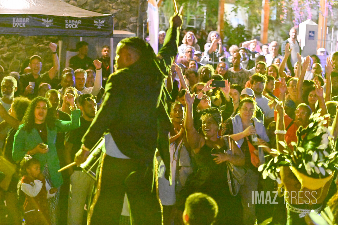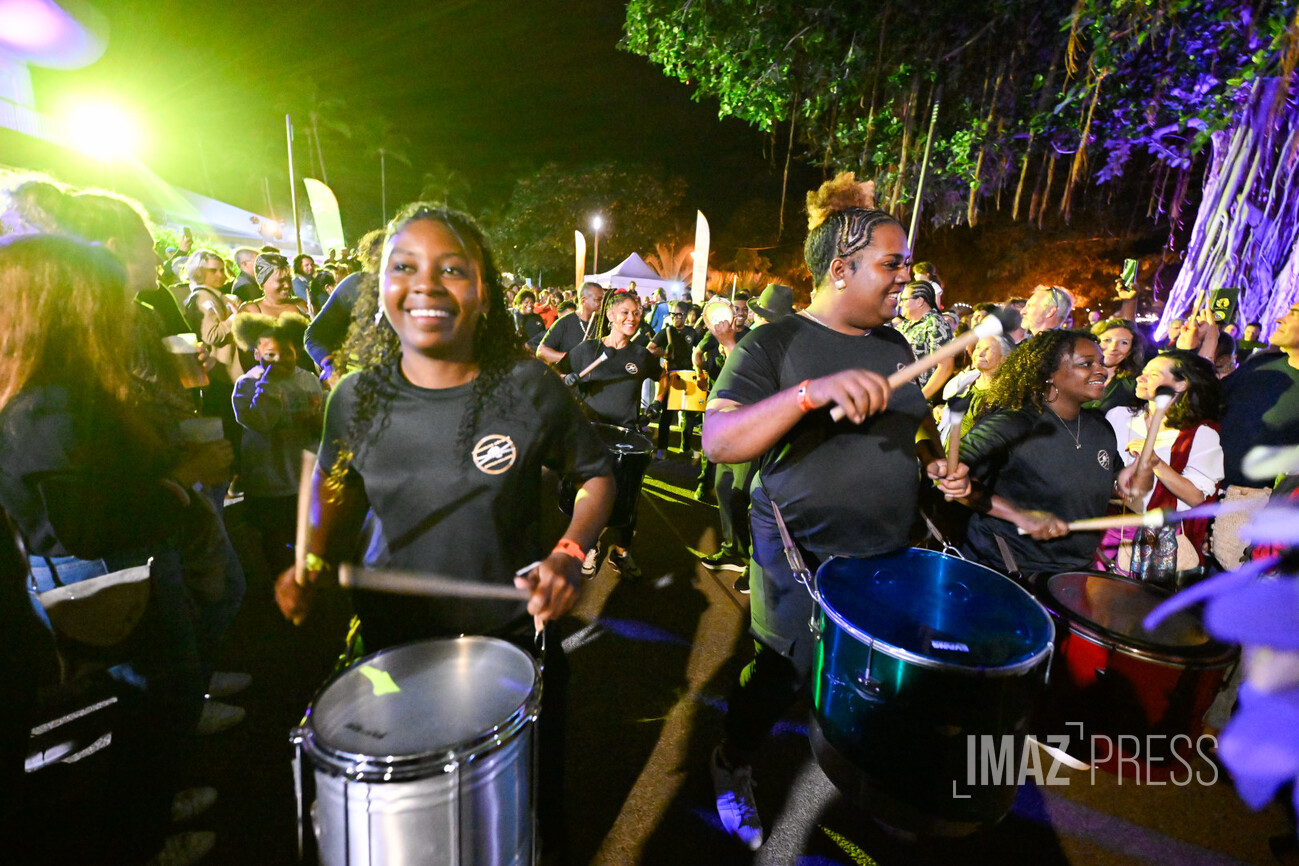 À 19 heures, la batucada portoise des Tambours Réyoné a de nouveau fait vibrer le village du festival Jazz dann Port. Accompagnés du maître brésilien des atabaques Jorge Bezerra, les musiciens ont livré un spectacle digne du carnaval de Rio, à la sauce péi. Au cœur du public, toutes les générations ont dansé au son des percussions, dans une ambiance de folie. Écoutez.