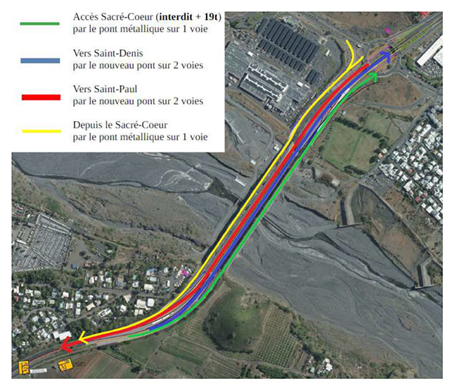 Le pont est interdit aux piétons et aux vélos. L'accès leur sera autorisé "lorsque l’axe "modes doux" de plus de 3 mètres de large situé côté mer sera finalisé d’ici la mi-avril 202" note le TCO. Les poids lourds de moins 19 tonnes ne plus obligés d’emprunter l’axe mixte de Cambaie puisque le gabarit du nouveau pontpeut supporter leur poids contrairement à l’ancien pont métallique. "Ce dernier devrait être déconstruit en 2021 dès que la bretelle de sortie aura été basculée sur le nouvel ouvrage" indique le Territoire de la côte ouest.