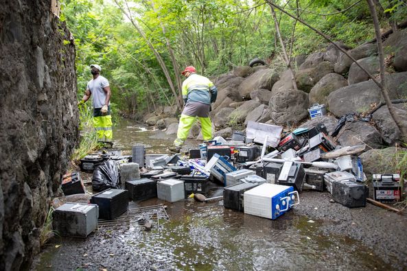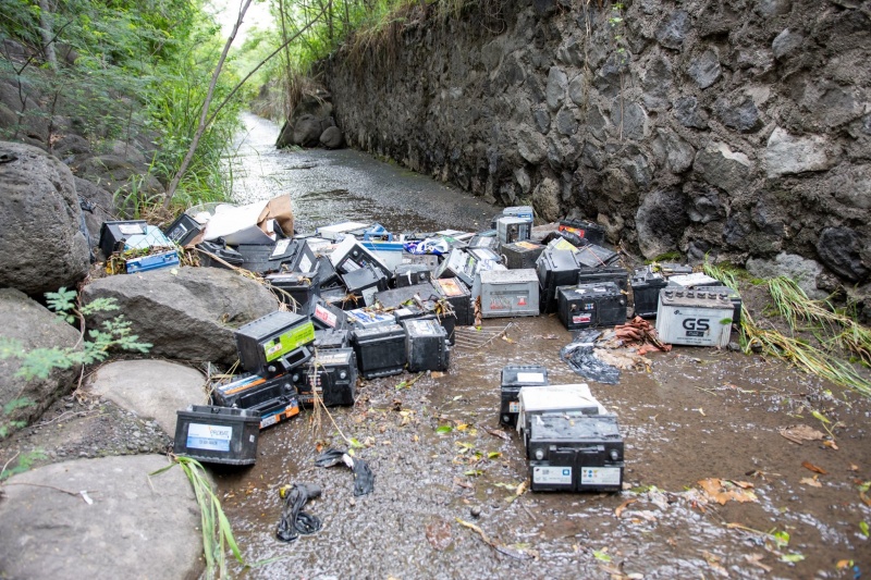 149 batteries de voitures et de poids-lourds ont été jetées en pleine nature dans une petite ravine de la zone industrielle n°3 du Port. Ce dépôt illégal a eu lieu sous les yeux d'un témoins. Cet administré a ensuite averti la police municipale. "Grâce à la plaque d'immatriculation du camion pollueur, le propriétaire du véhicule a été identifié. Il sera convoqué par la police nationale pour dépôt illégal de déchets dangereux" indique la mairie du Port. Une opération de dépollution du site a été effectué ce lundi 26 avril 2021 (Photo : mairie du Port)