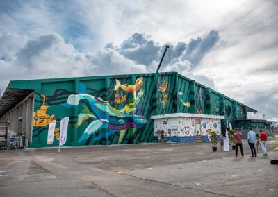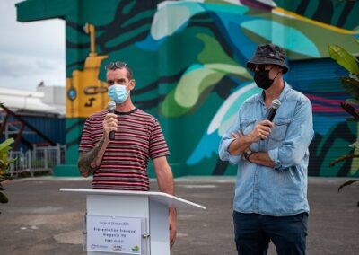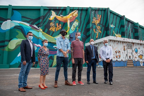 Des gouzous, des baleines, des scaphandriers, une grotte en forme de coeur de quoi redonner des couleurs au Port ouest. Sur une façade de 45m de long du magasin 90, Jace et Gorg One se sont associés pour la réalisation d'une oeuvre exceptionnelle de près de 500 m2. Une oeuvre réalisée en une semaine seulement dans le cadre du projet Ville-musée portée par la ville du Port depuis 2015 auquel s'est associé le Grand port maritime de La Réunion (GPMDLR). La présentation de cette oeuvre a eu lieu le jeudi 25 mars 2021 en présence de plusieurs personnalités. Nous publions ci-dessous le communiqué de presse de la ville du Port. (Photos ville du Port)