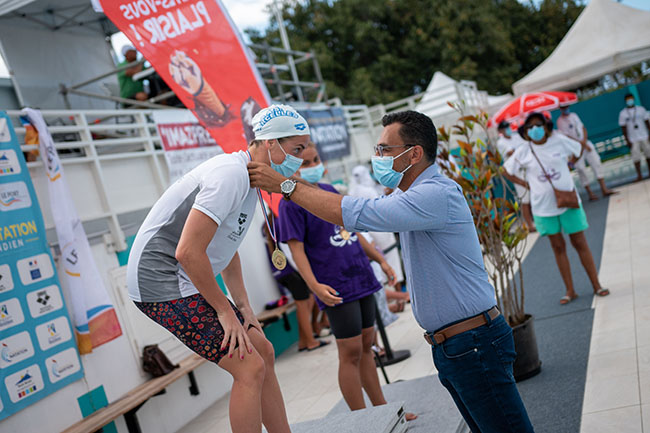 La troisième et ultime journée du meeting de natation de La Réunion débute ce lundi 21 décembre 2020. Dimanche, ce sont de nouveau de belles performances qui ont été effectuées à la piscine du Port. Le maire de la commune, Olivier Hoarau, était d'ailleurs présent aux côtés de l'adjoint aux sports Guy Pernic, pour remettre leur médaille aux gagnants. C'est la première fois qu'ils remettent des récompenses sur place depuis la rénovation du bassin (Photo mairie du Port)