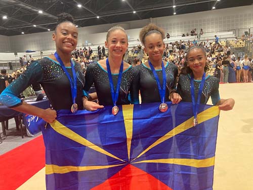 Les filles du club de l'Union sportive Portoise de gymnastique et sports acrobatiques (USPGSA) terminent sur la deuxième marche du podium des championnats de France de gymnastie, catégorie 10 ans et plus (Division 1). L'équipe composée de Saphira Dijoux, Elėanor Neveu, Moana Peyrard et Rosane Dubard Berby revient d'Oyonnax (Ain) avec la médaille d'argent à l'issue d'une compétition très serrée. Nous publions ci-dessous le communiqué de la ville du Port. (Photo : ville du Port)