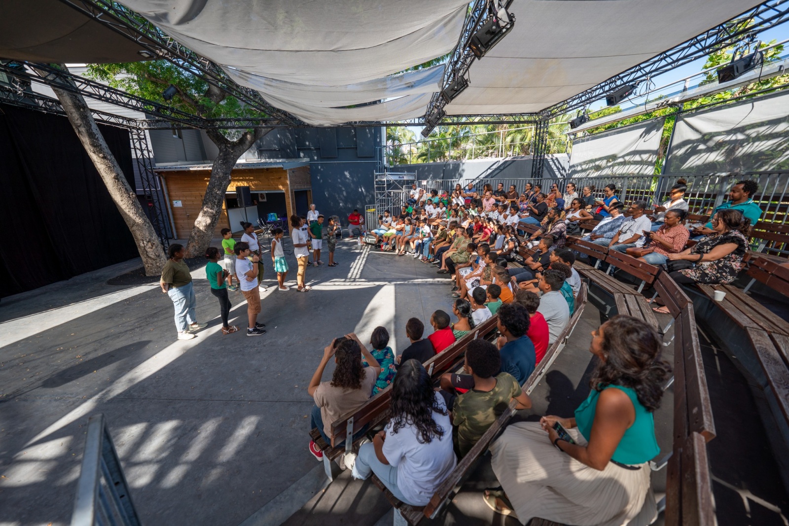 Avec les CM2, deux autres classes, CM1 de l’école Charles Vendomèle et 6ème du Collège Titan (projet de liaison école/ collège), ont participé à cette restitution, au Théâtre sous les arbres. Les fonnkèrs ont été écrits et mis en musique dans le cadre d’un projet pédagogique autour de la poésie et de la culture créole. Il s’agissait de réconcilier les enfants avec le créole (écriture et parler créole). Les élèves ont été accompagnés dans cette démarche par leurs professeurs et les fonnkézers Gaël Velleyen et Teddy Iafare Gangama.