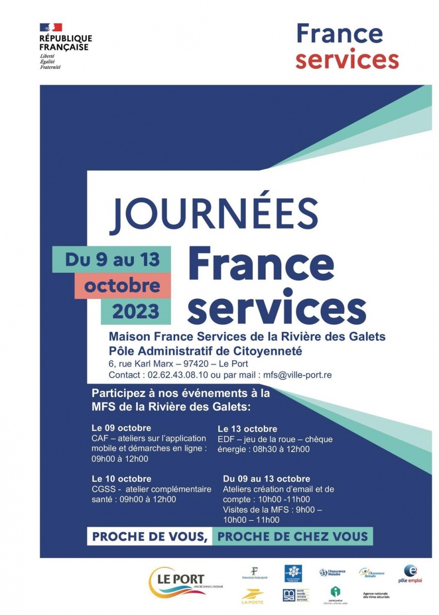 La maison France Services (MFS) de la Rivière des Galets (le Port) accueillera le public du lundi 9 octobre au vendredi 13 octobre 2023 au Pôle administratif et de citoyenneté labellisé MFS (Maison France Services) depuis novembre 2022.