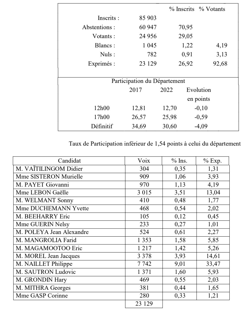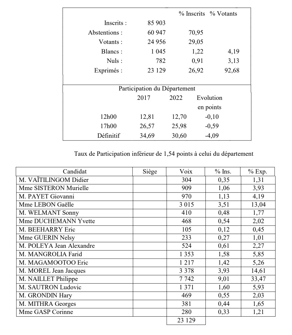 Les résultats définitifs de la 1ère circonscription placent Philippe Naillet, député sortant, et Jean-Jacques Morel en tête. Le premier totalise 33,47% des suffrages et le second arrive loin derrière avec 14,61% des voix. Tous deux iront au second tour dimanche 19 juin.