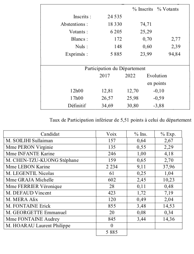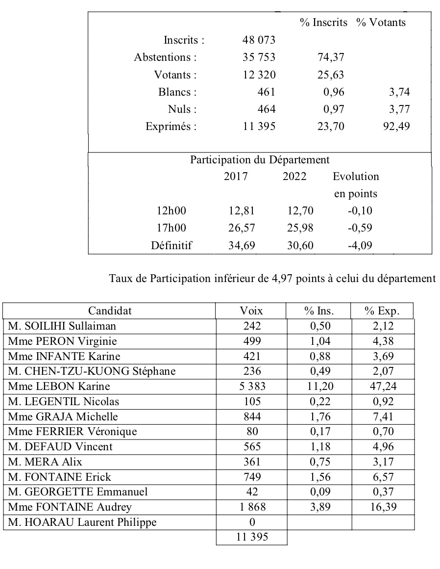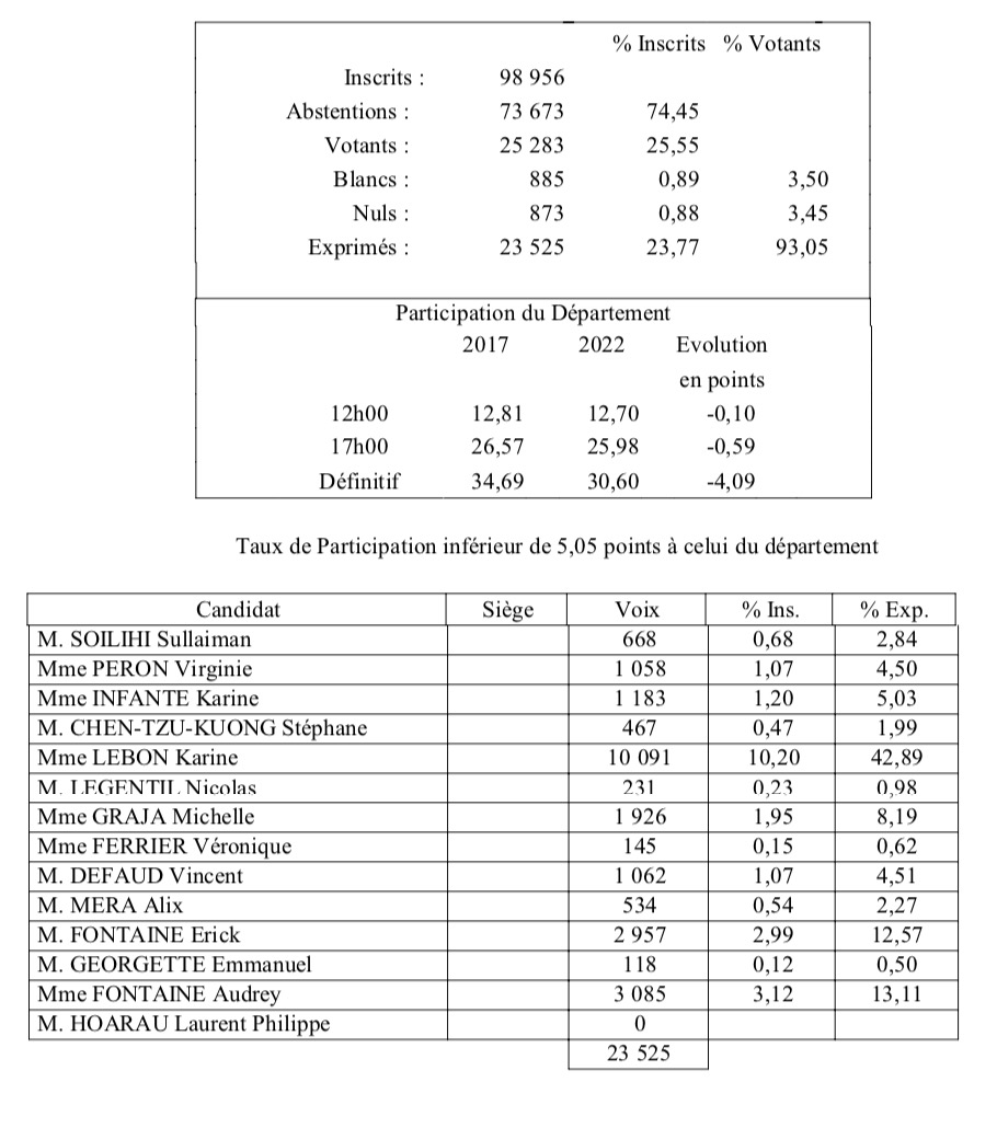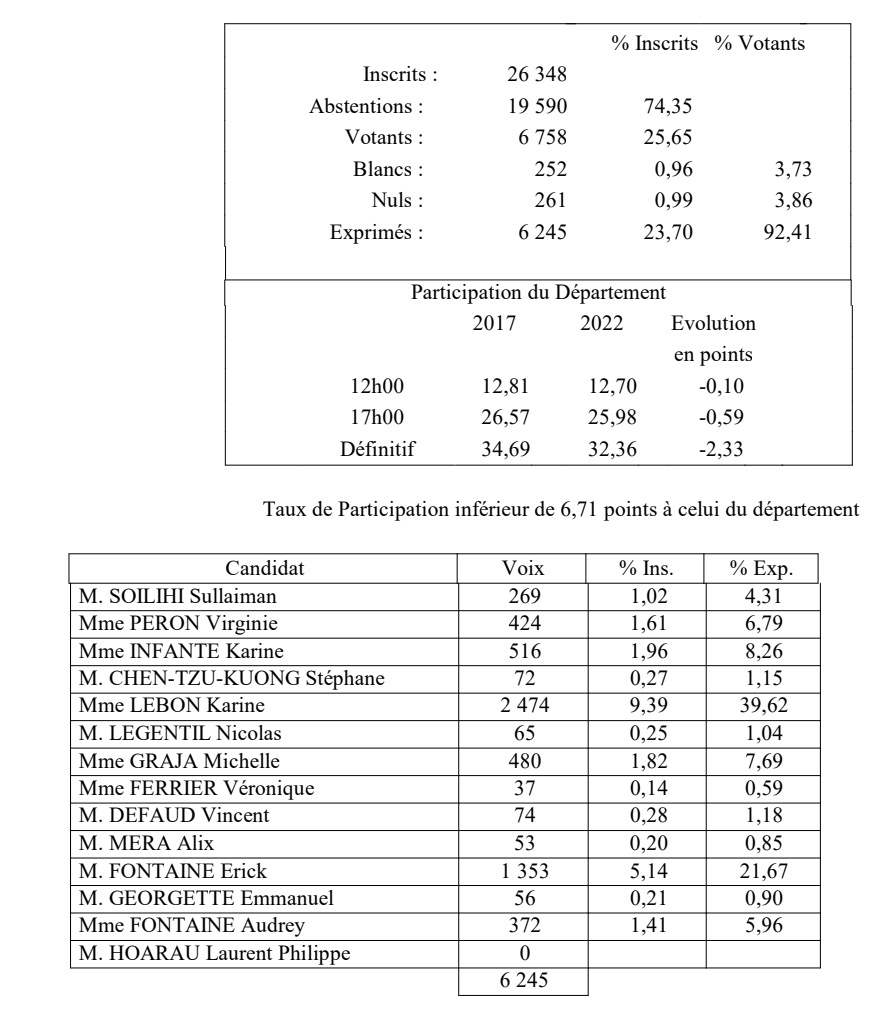 Karine Lebon, députée sortante, arrive largement en tête dans la 2ème circonscription avec 42,89% des suffrages exprimés. Audrey Fontaine, qui cumule 13,11% des voix, est elle aussi qualifiée pour le deuxième tour.