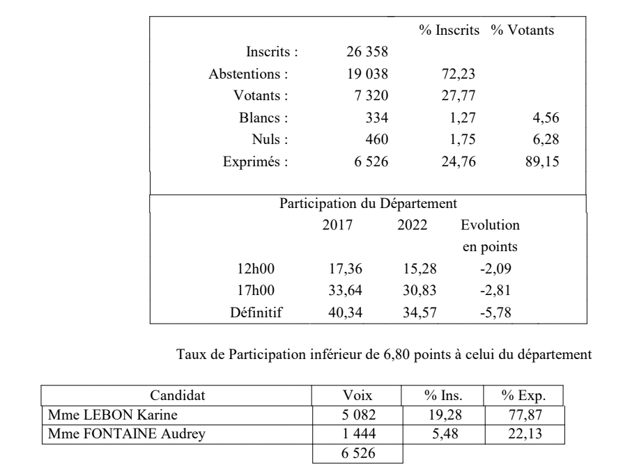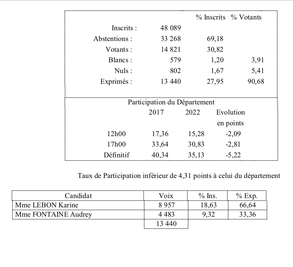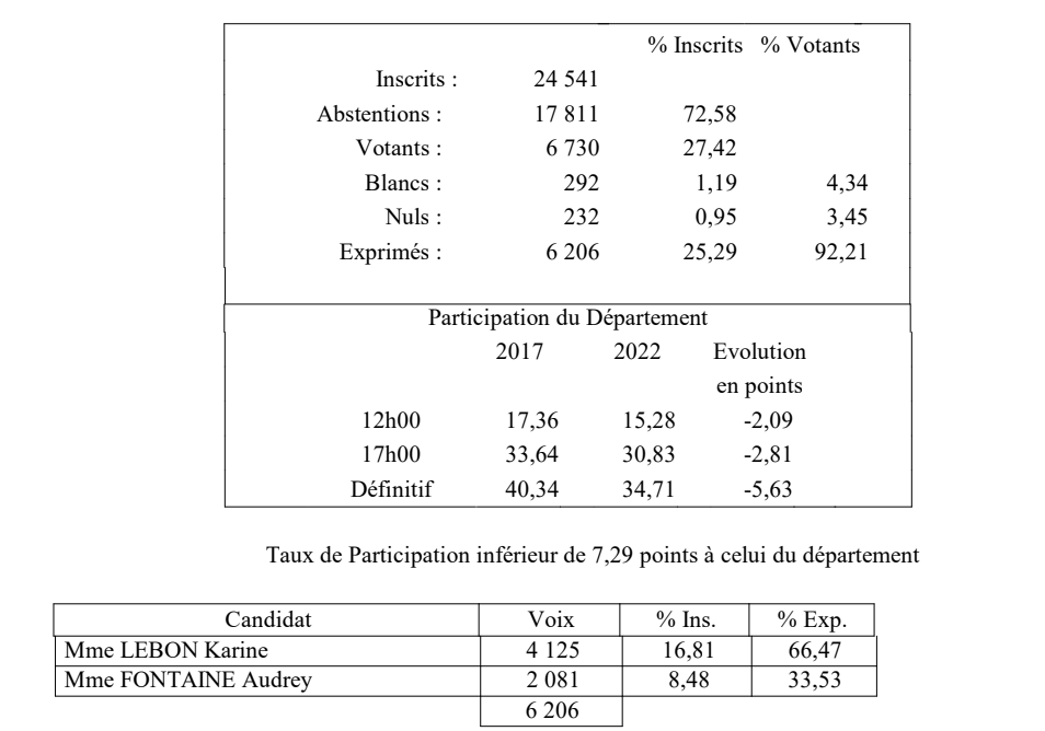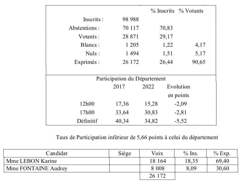 Belle victoire de Mme LEBON. Se pose la question du mauvais casting à droite. Pour les prochaines élections si c encore fontaine, elle ne sera plus au second tour. Elle sera dépassé par le fn. Fontaine ne fait pas l'unanimité.