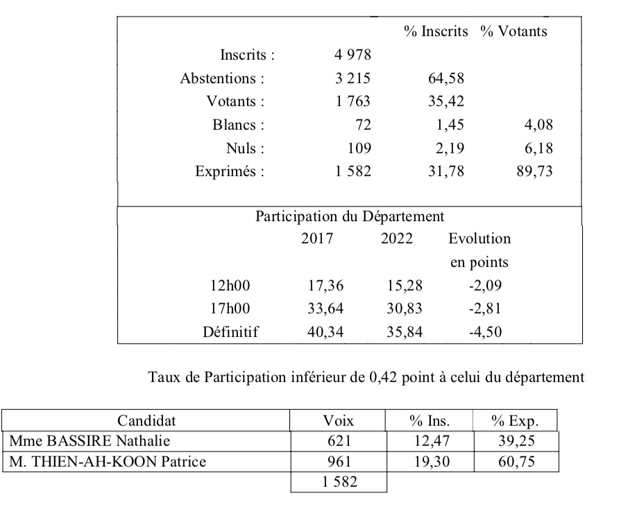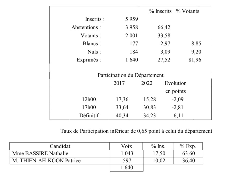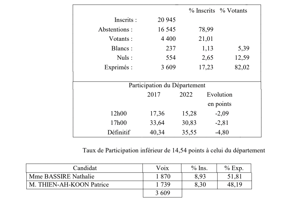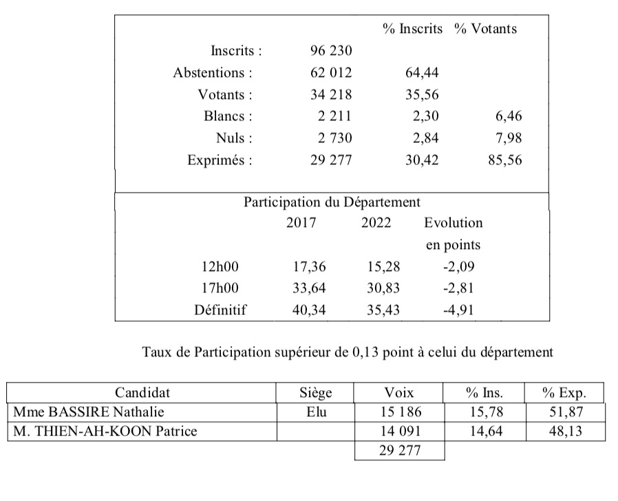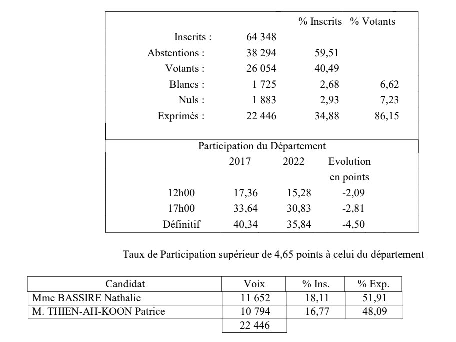 Nathalie Bassire est réélue dans la 3ème circonscription face à Patrice Thien-Ah-Koon, avec 51,87% des voix contre 48,13% pour son adversaire. Elle entame donc son deuxième mandat en tant que députée