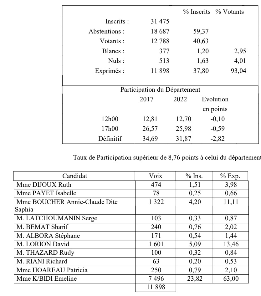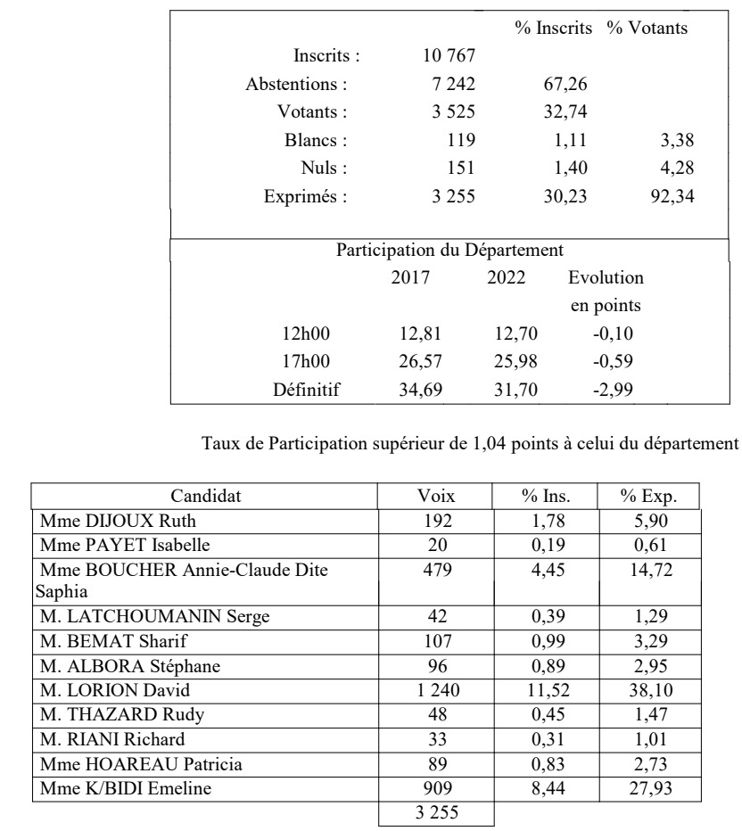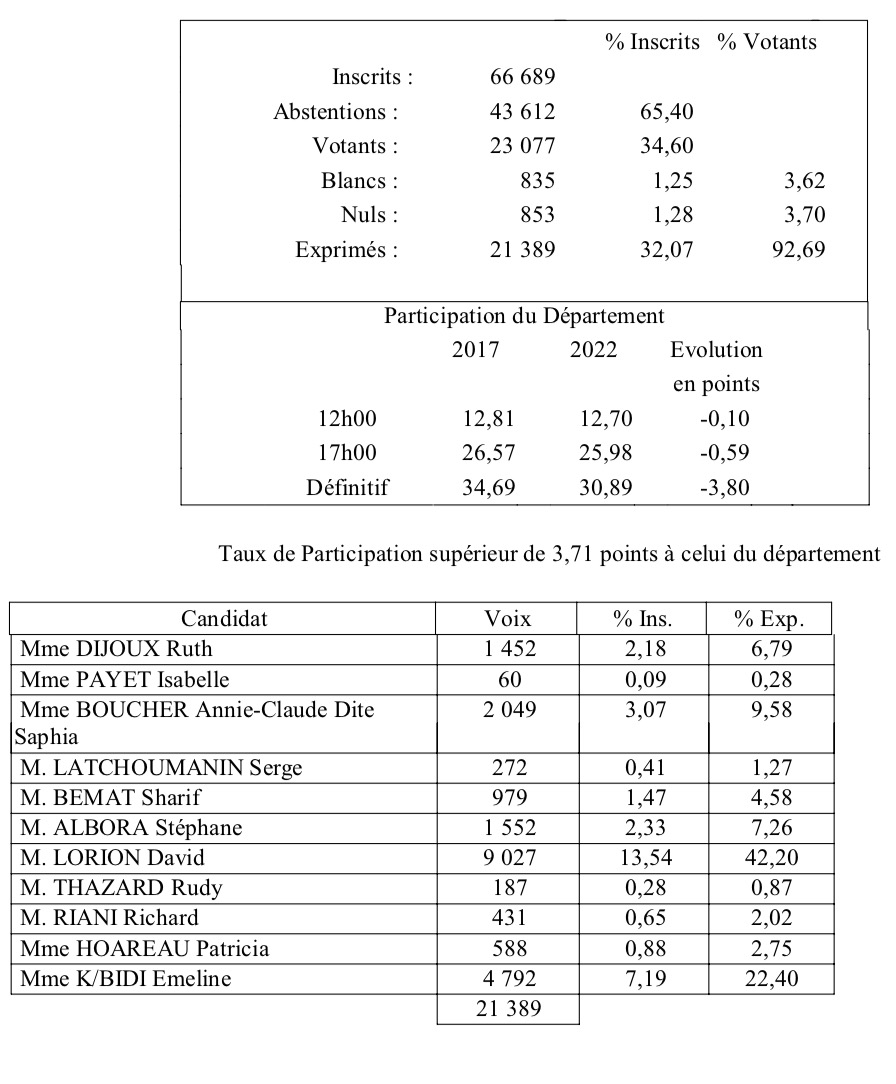 Les résultats définitifs de la 4ème circonscription sont tombés. Emeline K'Bidi arrive devant David Lorion avec 36,11% des voix, tandis que le député sortant et candidat LR totalise 32,48%. Tous deux iront donc au second tour. (Photo photo RB imazpress)