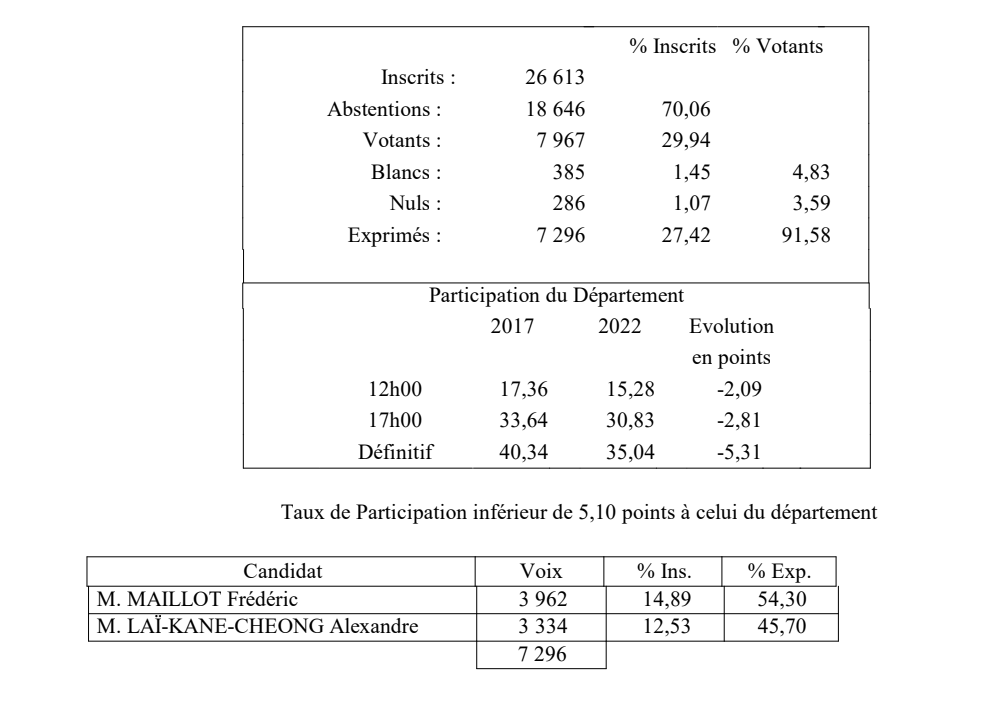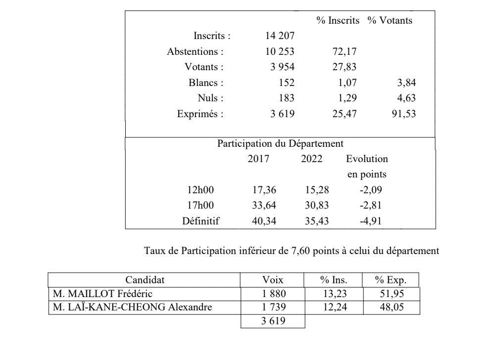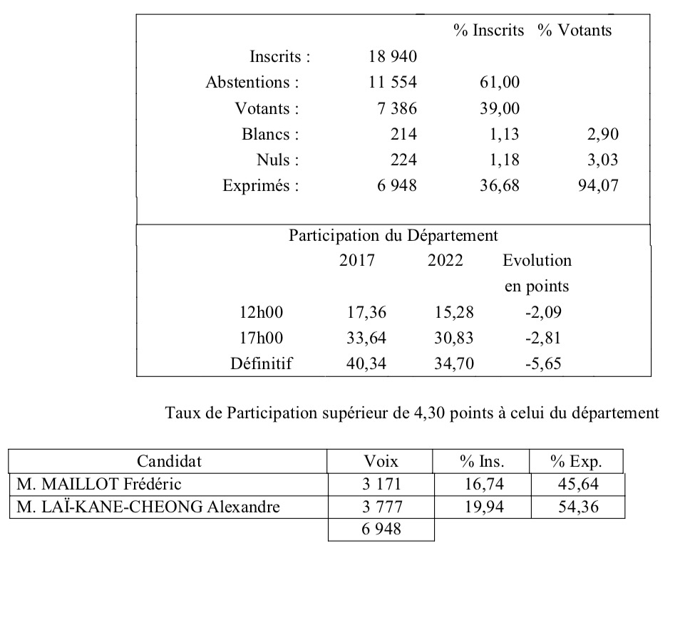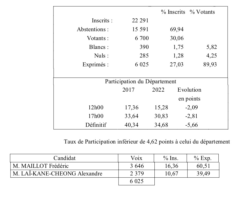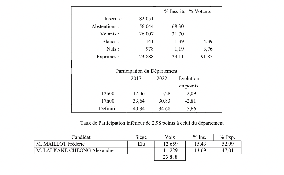 Frédéric Maillot arrive en tête devant Alexandre Laï-Kane-Cheong dans la 6ème circonscription avec 52,99% des votes contre 47,01% pour son adversaire. Frédéric Maillot va donc entamer son tout premier mandat de député.