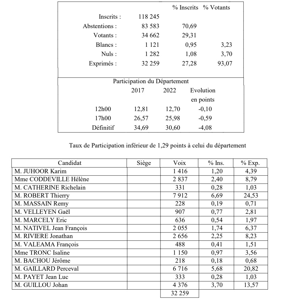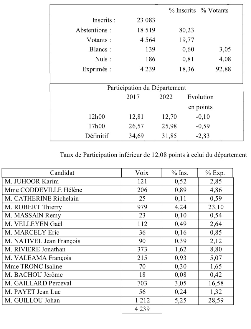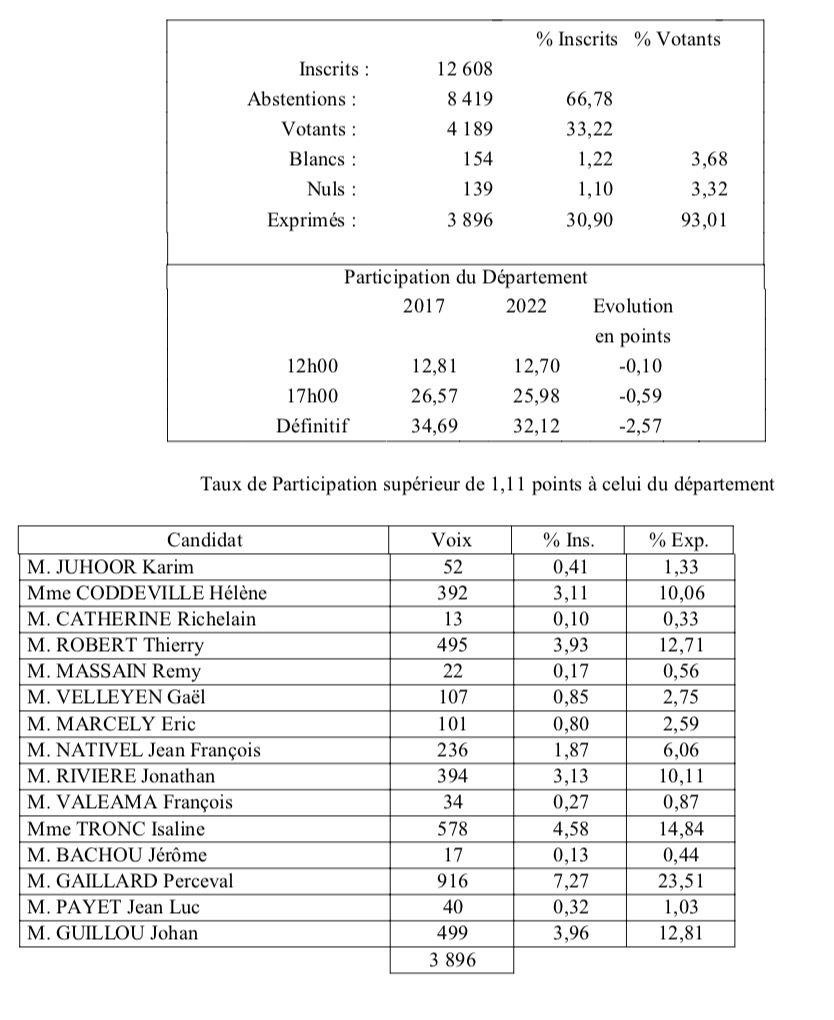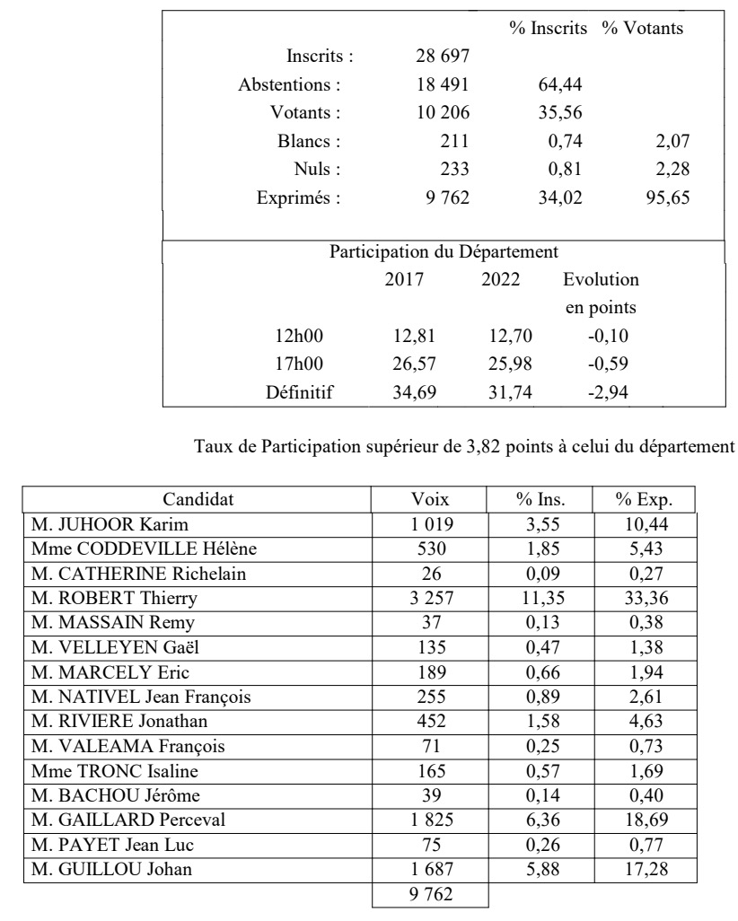 Les résultats de la 7ème circonscription donnent Thierry Robert (24,53%) et Perceval Gaillard (20,82%) en tête. John Guillou est donc exclu du second tour, il totalise 13,57% des voix. (Photo photo RB imazpress)