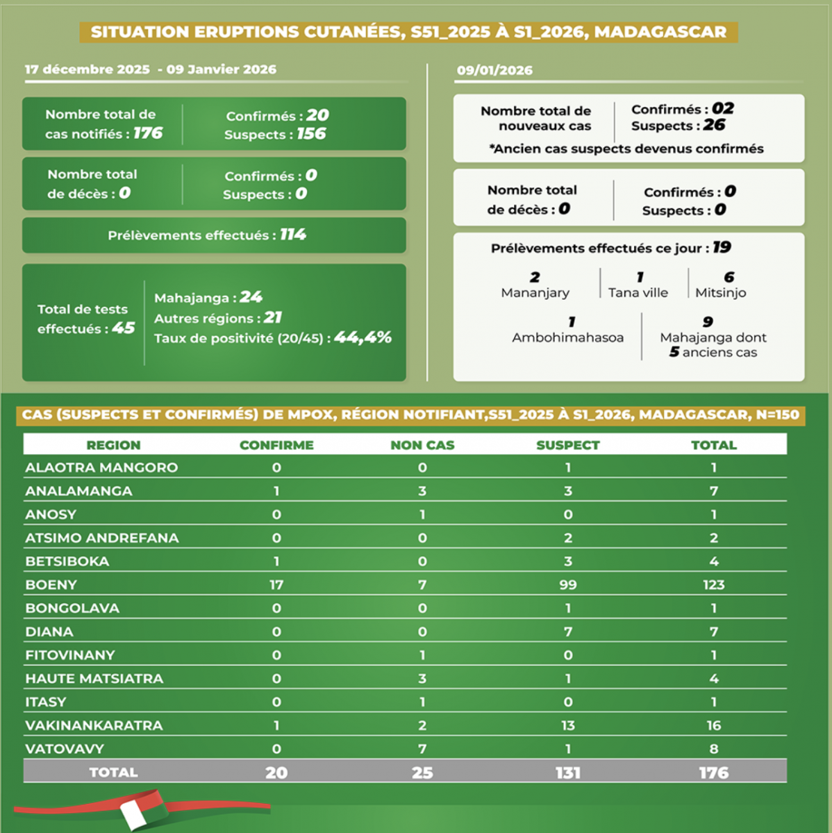Selon le dernier bilan épidémiologique publié par le ministère de la Santé publique malgache au vendredi 9 janvier 2026, 176 cas suspects ont été notifiés depuis la mi-décembre 2025, dont 20 cas confirmés biologiquement. Aucun décès n’est à déplorer à ce stade.