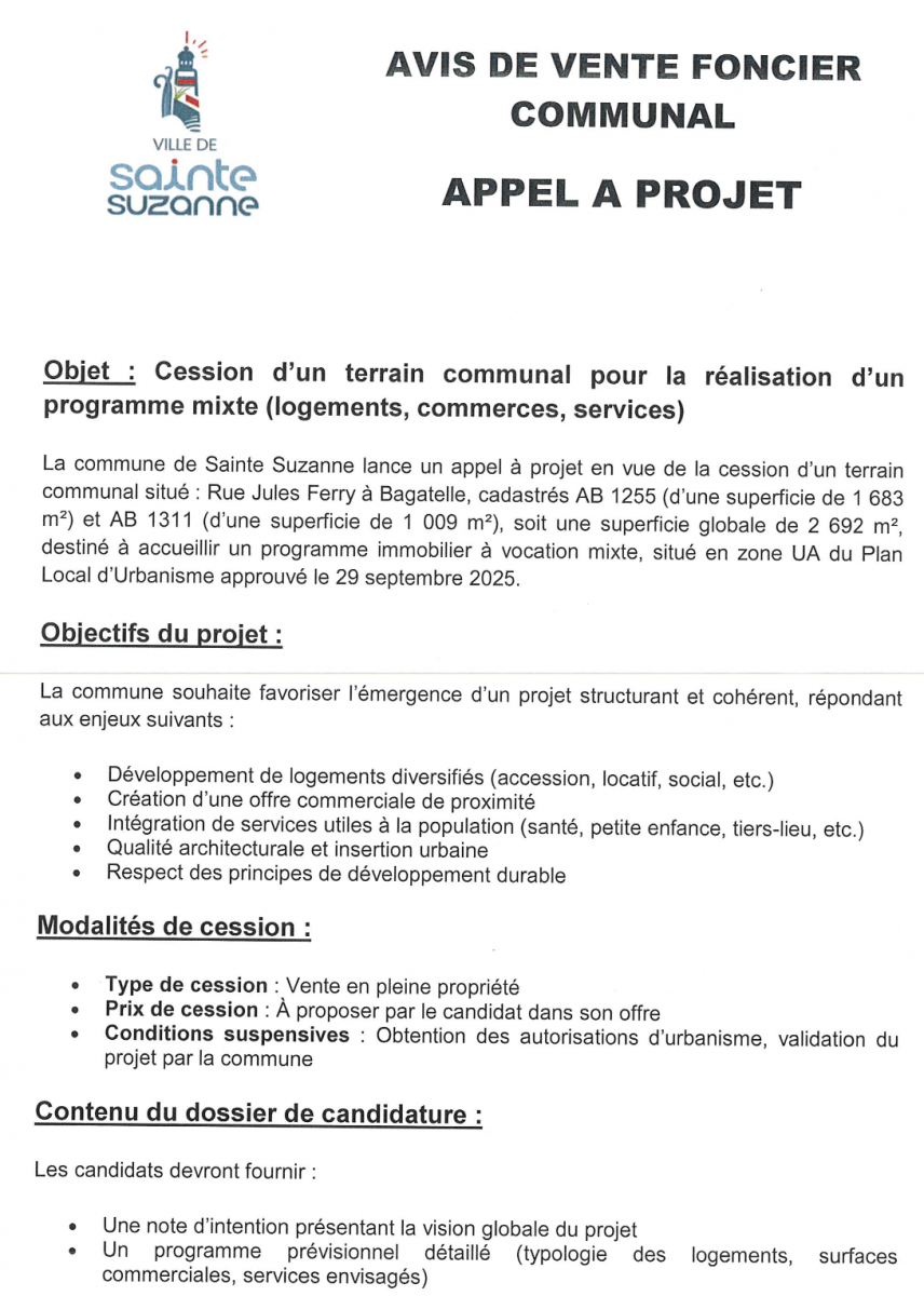 VILLE DE SAINTE SUZANNE - AVIS DE VENTE FONCIER COMMUNAL