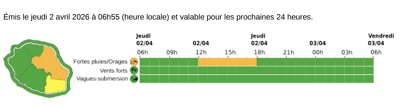 Les averses se déclenchent à l'intérieur des terres, notamment sur les hauts du sud et elles sont parfois de bonne intensité. Elles peuvent prendre un caractère orageux sur le sud-est et le massif de la Fournaise.