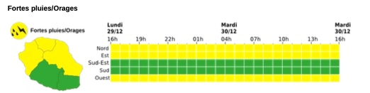 La région est de La Réunion est en vigilance orange fortes pluies et orages depuis 4h et au moins jusqu'à 12h ce lundi matin 29 décembre 2025. Le nord et l'ouest sont en vigilance jaune fortes pluies et orages également jusqu'à midi. Prenez donc vos précautions et n'oubliez pas votre parapluie