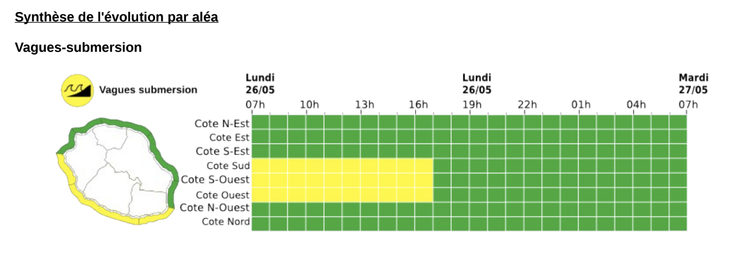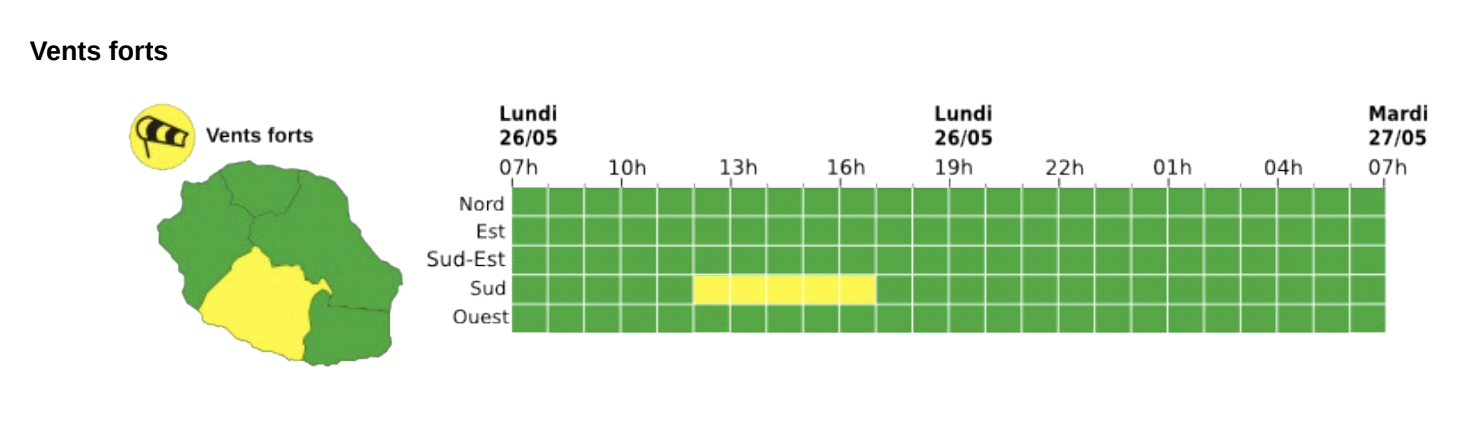 Il faut s'attendre à des rafales voisines de 60 km/h entre Sainte-Rose et Saint-Denis ou sur le Sud Sauvage et 70 km/h entre la pointe au Sel et Saint-Joseph. Les rafales sont également sensibles dans les hauts exposés où elles avoisinent les 60 km/h.