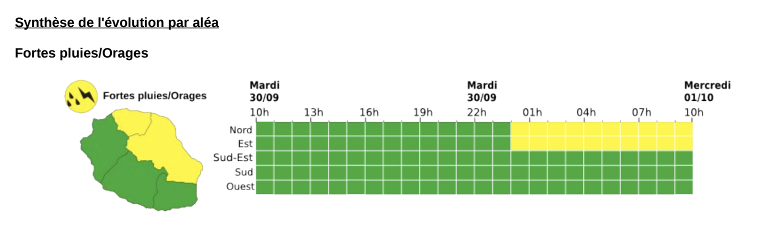 Avant la fin de nuit, "la couverture nuageuse se généralise au département, à l'exception de l'extrême ouest et de la côte sud-ouest et les pluies progressent en direction du Port, des cirques jusqu'au Sud sauvage", note Météo France.