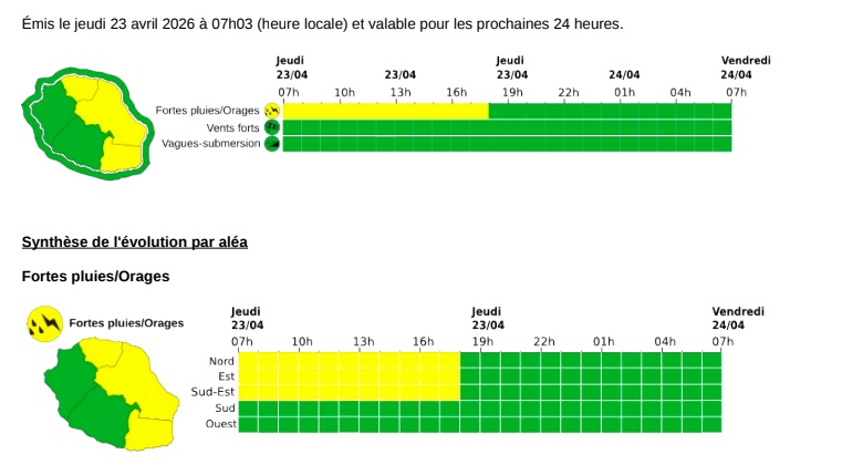 Ce jeudi 23 avril 2026, Météo France Réunion place trois zones de l'île en vigilance jaune fortes pluies orages depuis 7 heures ce matin. La levée de cette alerte est prévue à 18h ce jeudi. (Photo d'illustration : Richard Bouhet/www.imazpress.com)