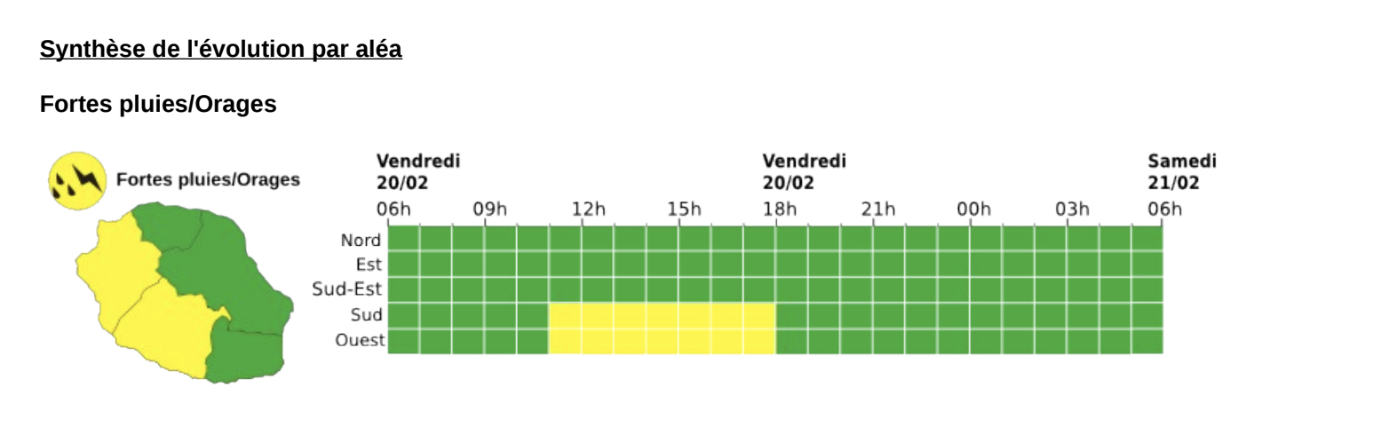 Une vigilance jaune fortes pluies, orages est émise ce vendredi 20 février 2026 entre 11 heures et 18 heures sur les zones ouest et sud de La Réunion. "Des averses sont attendues l'après-midi d'abord dans les hauts puis par débordements sur le littoral ouest et sud. Ces dernières peuvent être localement fortes en particulier sur les hauteurs du sud et de l'ouest et accompagnées de coups de tonnerre", indique Météo France (Photo : rb/www.imazpress.com)