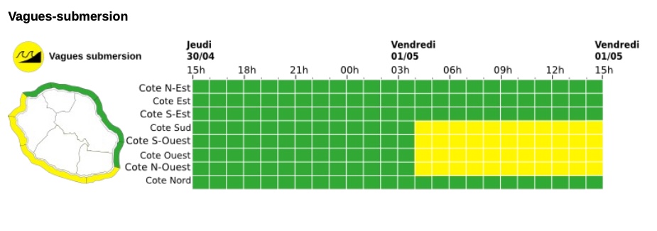 Les côtes nord-ouest, ouest et sud-ouest seront placées en vigilance jaune vagues-submersion à partir de 4h du matin ce vendredi 1er mai 2026. "La houle australe déferle sur les côtes réunionnaises avec des hauteurs approchant les 3 mètres 50, générant ainsi une mer forte sur l'Ouest et le Sud", note Météo France. La houle s'amortit lentement l'après-midi jusqu'au lendemain (Photo d'illustration Richard Bouhet/www.imazpress.com)