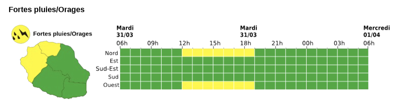 Ce mardi 31 mars 2026, Météo France a émis un bulletin de vigilance jaune fortes pluies et orages pour le nord et l'ouest de La Réunion. La vigilance entrera en vigueur à midi jusqu'à 19 heures. "Dès la mi-journée, les nuages laissent échapper de bonnes averses, principalement en zones de relief. La zone de la route en Corniches essuie également des précipitations dans le courant de l'après midi.", indiquent les prévisions (Photo : Richard Bouhet / www.imazpress.com)