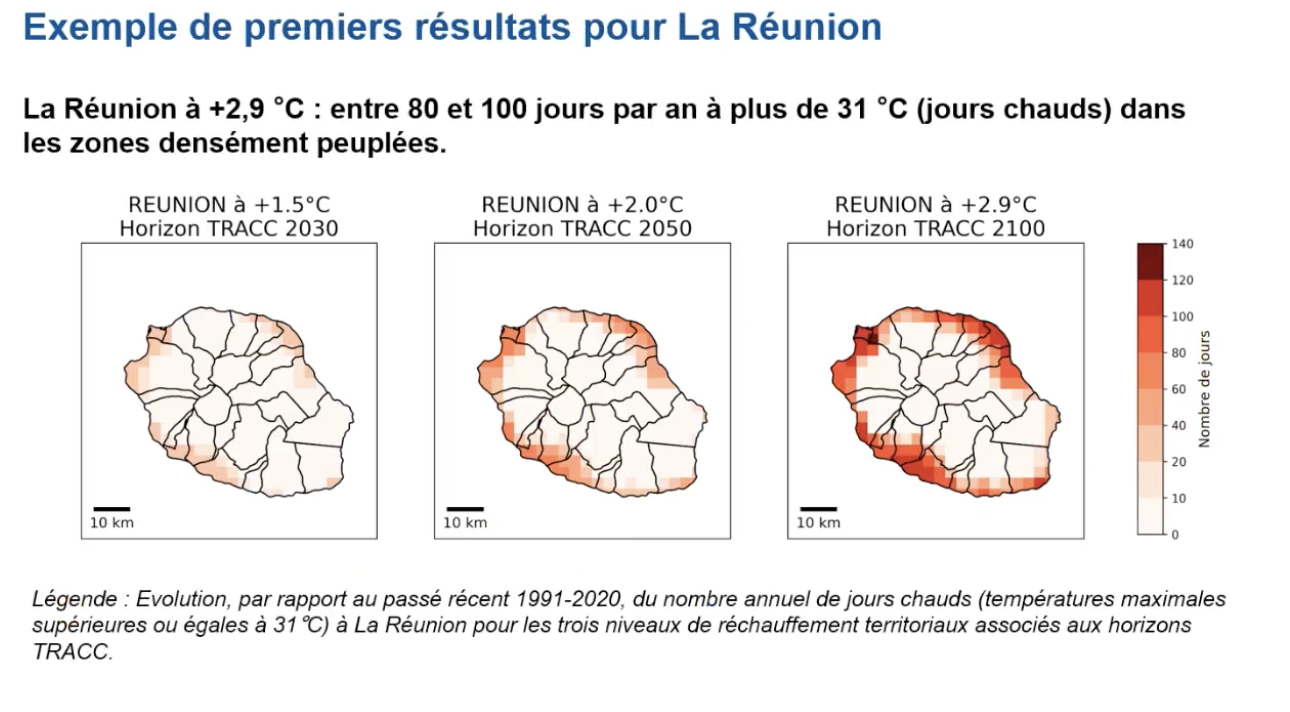 Qui dit réchauffement du climat, dit jours de plus en plus chauds. Actuellement, La Réunion compte en moyenne une dizaine de jours chauds par an (à plus de 32 degrés) dans les zones densément peuplées.