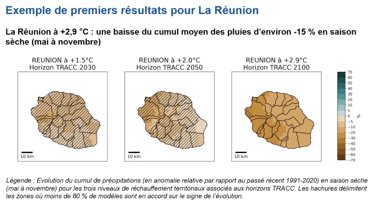 Alors que l'île connait déjà un déficit pluviométrique inquiétant, à l'horizon 2100, avec une Réunion à plus de 2,9 degrés, le département devrait subir "une baisse du cumul moyen des pluies d'environ moins 15% en saison sèche (de mai à novembre)" et des "saisons sèches encore plus sèches et plus longues", souligne Céline Jauffret.