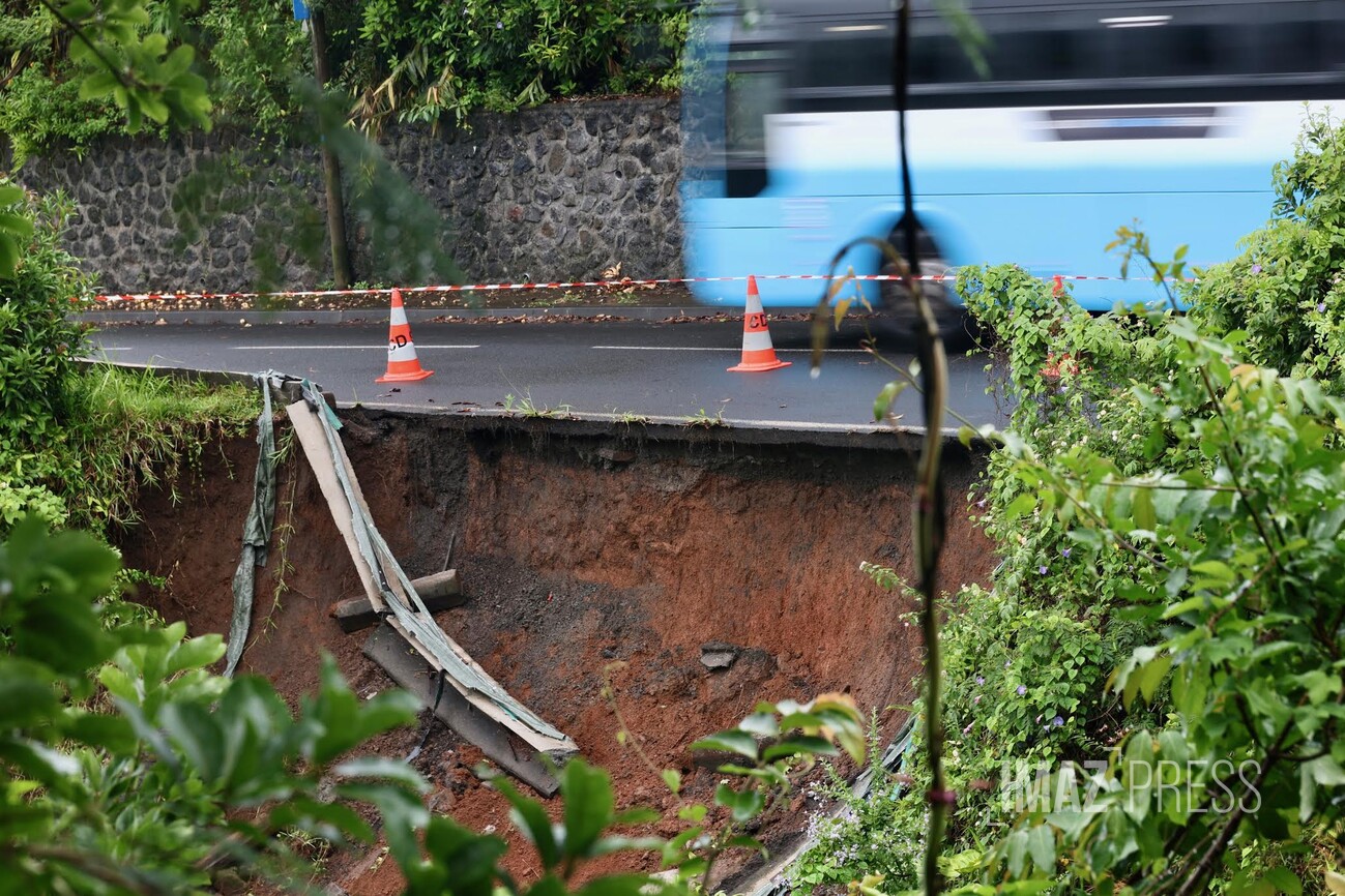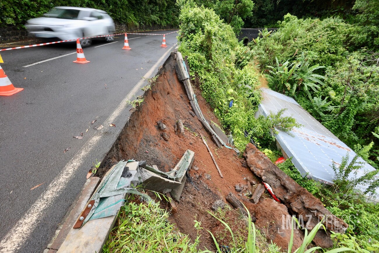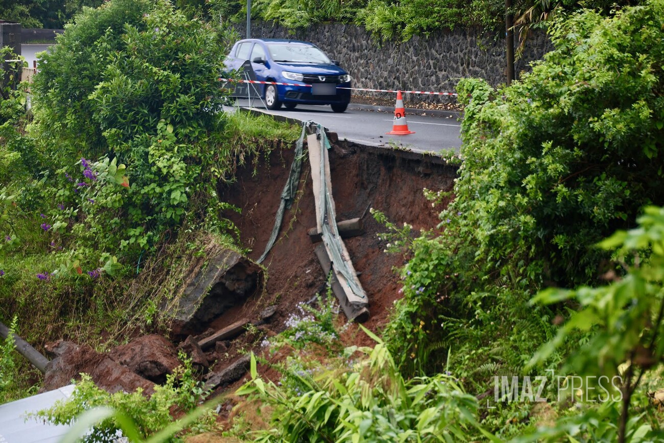 Une partie de la chaussée s'est effondrée sur la route de la Montagne à Saint-Denis dans le secteur de Terre Rouge ce mardi 30 décembre 2025. Il n'y a pas de blessé. Ce sont les fortes pluies qui sont à l'origine de cet effondrement. La circulation se fait en mode alterné. La plus grande prudence est recommandée dans ce secteur (Photo sly/www.imazpress.com)