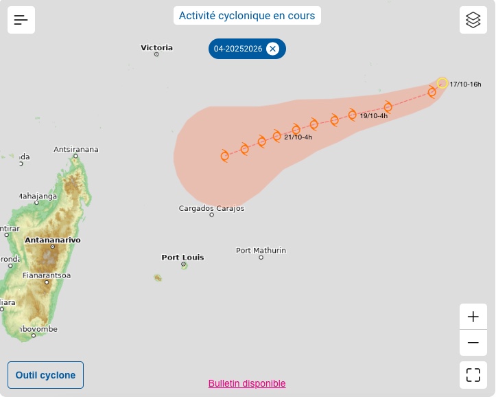 Météo France a débuté le suivi de la zone perturbée n° 04-20252026. Un système dépressionnaire est actuellement présent sur le sud-uest de l'océan Indien. Ce système est prévu de se diriger vers le sud-ouest tout en s'intensifiant en tempête tropicale. Toutefois, celle-ci va rester loin des terres habitées au cours des 5 prochains jours (Photo : rb/www.imazpress.com)
