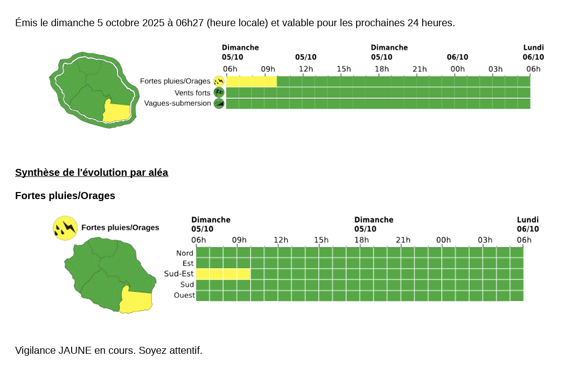 Depuis 4 heures ce dimanche 5 octobre 2025, le sud-est de l'île est placé en vigilance jaune fortes pluies et orages, annonce Météo France. "Le passage d'un front apportant un épisode pluvieux sur le sud de l'île, un renforcement du vent de sud et une baisse progressive des températures sont observés". La vigilance devrait être valable jusqu'à 10 heures. (Photo : sly/www.imazpress.com)