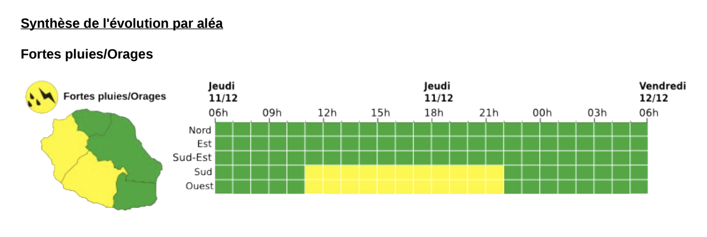 Les averses peuvent être modérées à fortes et plus nombreuses que mercredi, "principalement dans les hauts de la moitié sud et plus franchement ceux de Saint-Leu". Un coup de tonnerre peut même se faire entendre.