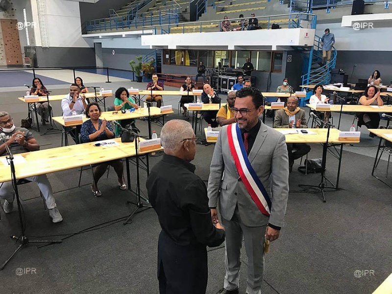 Le premier conseil municipal de la mandature 2020-2026 s'est réuni, ce mardi 26 mai, au complexe sportif municipal du Port, pour officiellement y introniser Olivier Hoarau comme maire. Elu dès le 1er tour du scrutin le 15 mars dernier avec 58,26% des voix, il entame là son deuxième mandat consécutif à la tête de la commune, après que les membres du conseil municipal l'aient plébiscité avec 33 voix contre 6 bulletins blancs. (Photo aa/www.ipreunion.com)