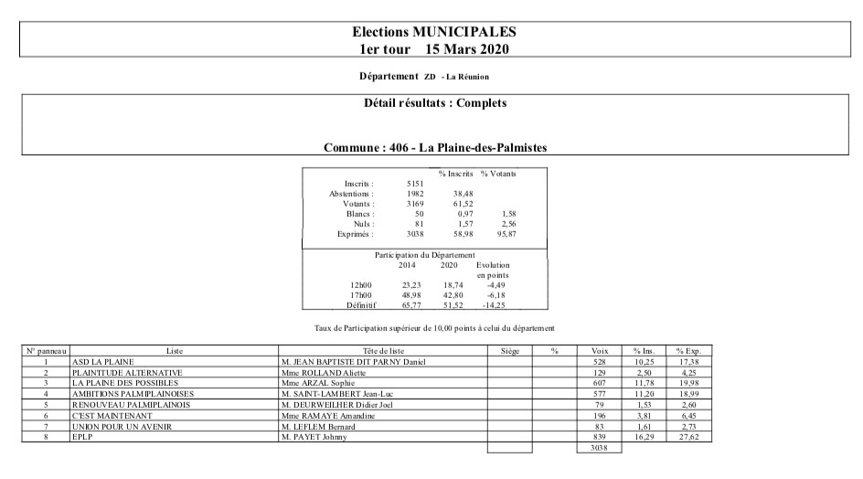 Plaine des Palmistes : Johnny Payet en tête (27,62%), il affrontera Sophie Arzal (19,98%), Jean-Luc Saint-Lambert (18,99%) et Daniel Jean-Baptiste (17,38%) au deuxième tour