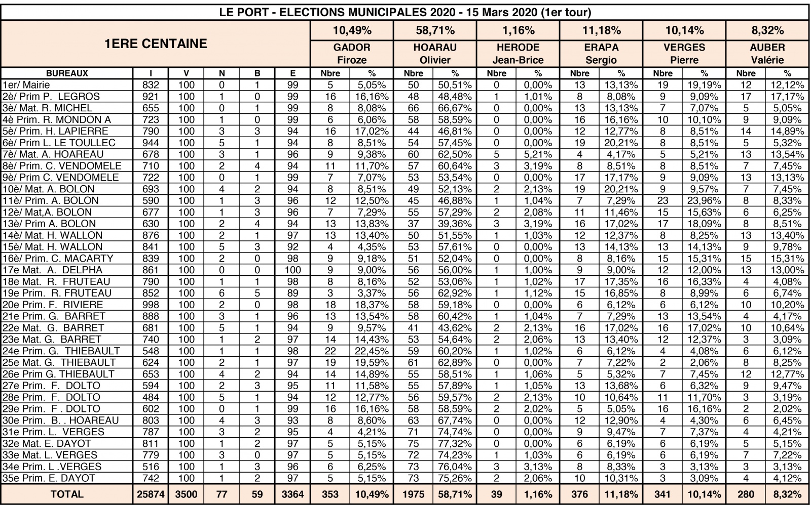Le dépouillement se poursuit au Port. La première centaine dans le bureau centralisateur à la mairie donne le résultat suivant :