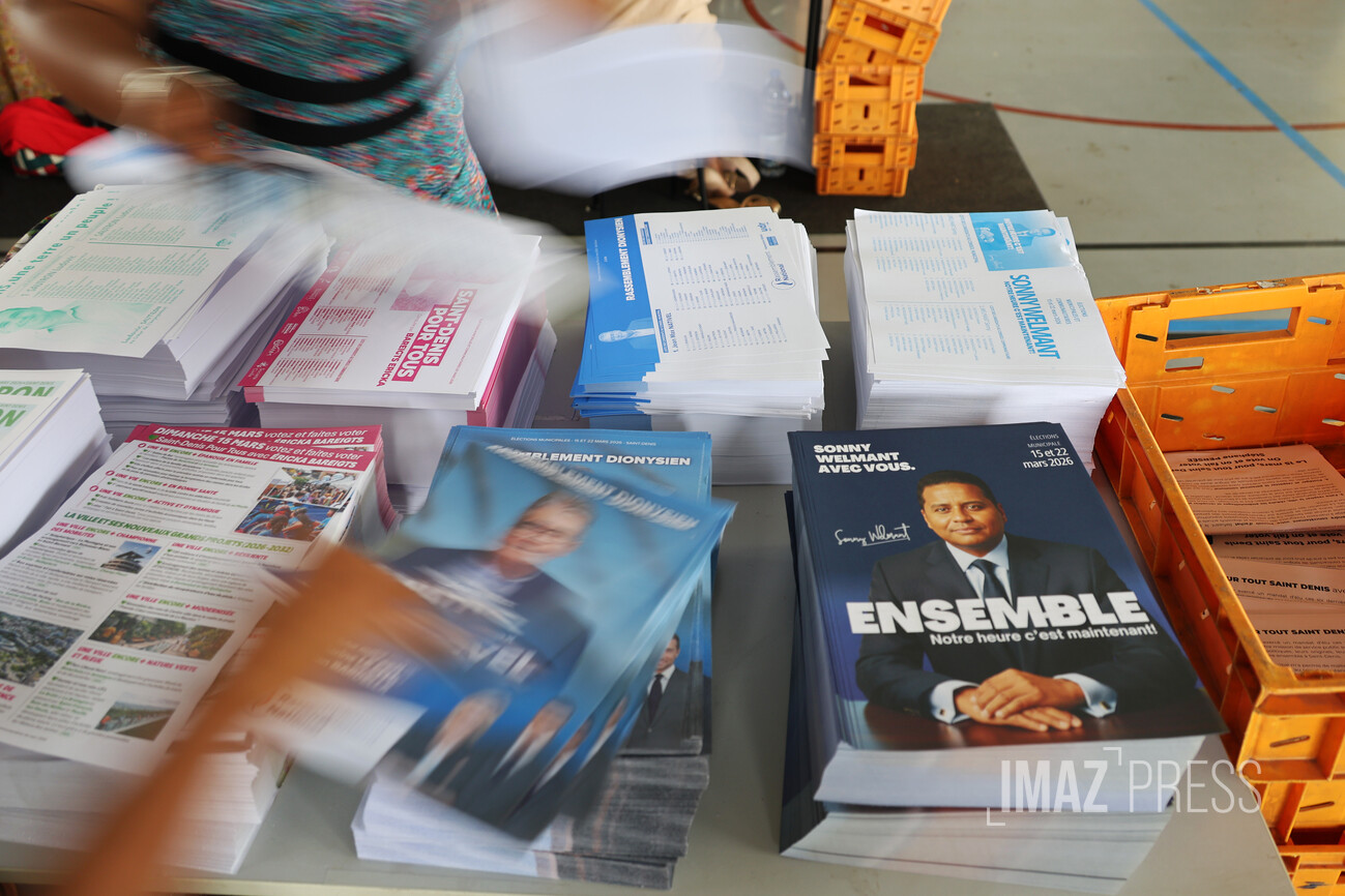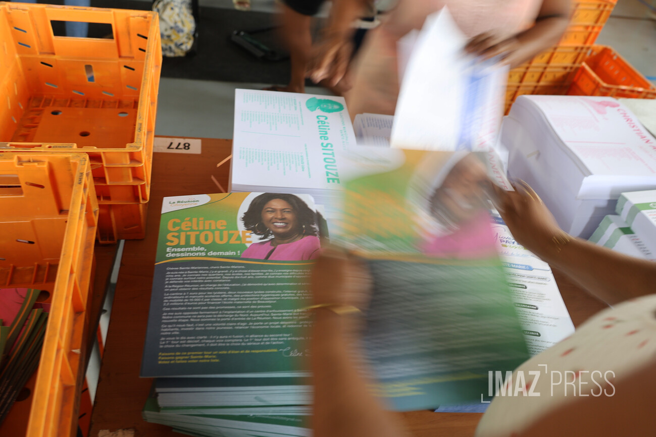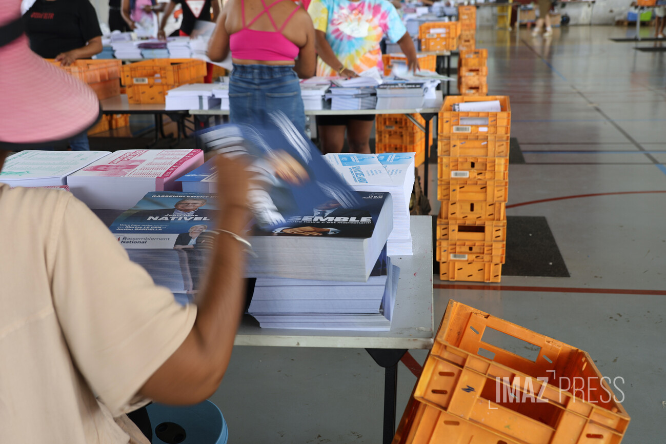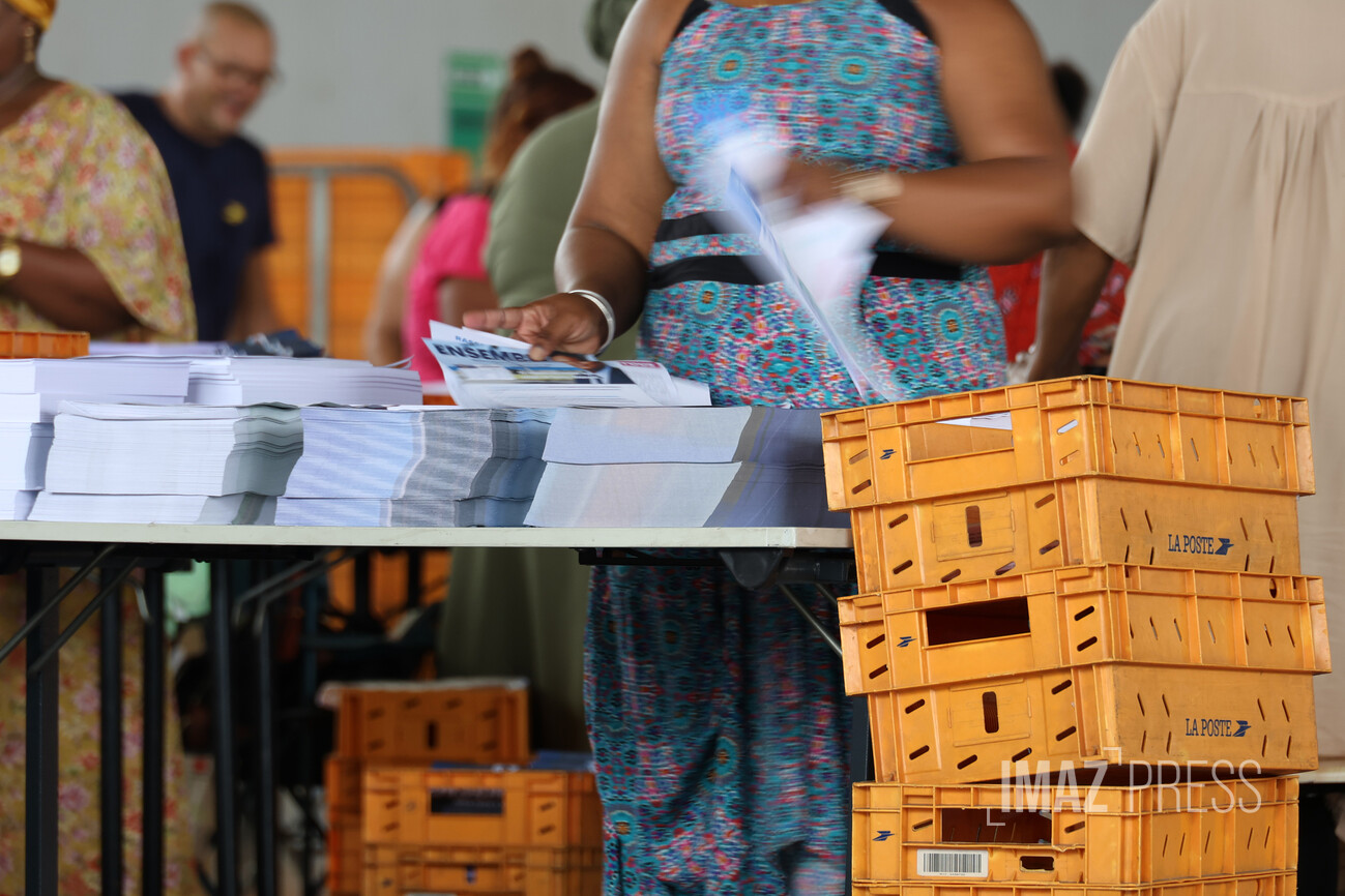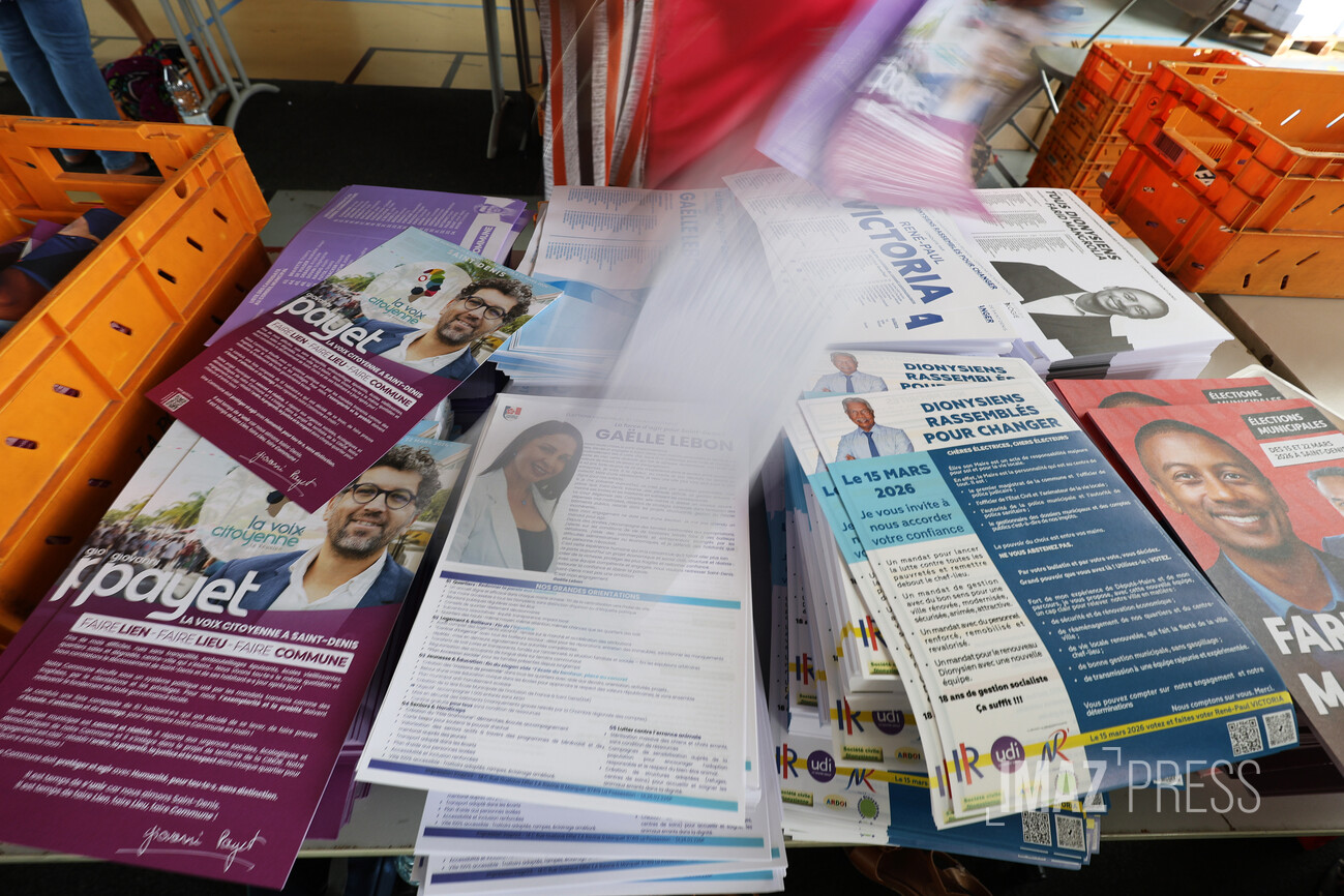 À l’approche du 1er tour des élections municipales qui aura lieu le 15 mars prochain, le matériel électoral se prépare. Des chantiers de mise sous pli ont lieu dans les 4 arrondissements de l’île. La mise sous pli consiste à mettre dans une enveloppe les professions de foi et les bulletins de vote des candidats à destination des électeurs (Photos : Stephan Laï-Yu/www.imazpress.com)
