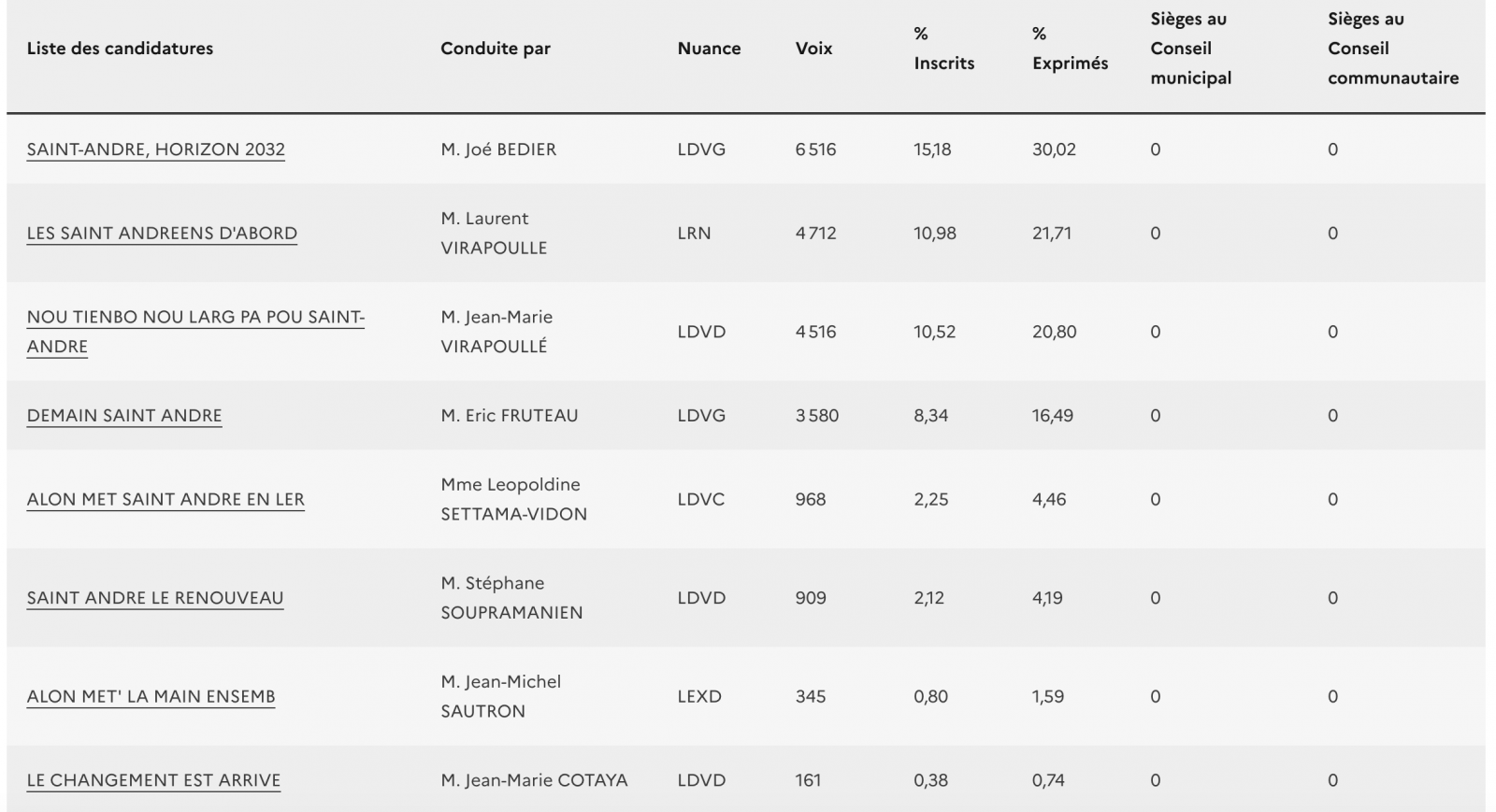 Dans la commune de Saint-André, lors du premier tour, Laurent Virapoullé avait rassemblé 21,71% des voix et Jean-Marie Virapoullé 20,80%.