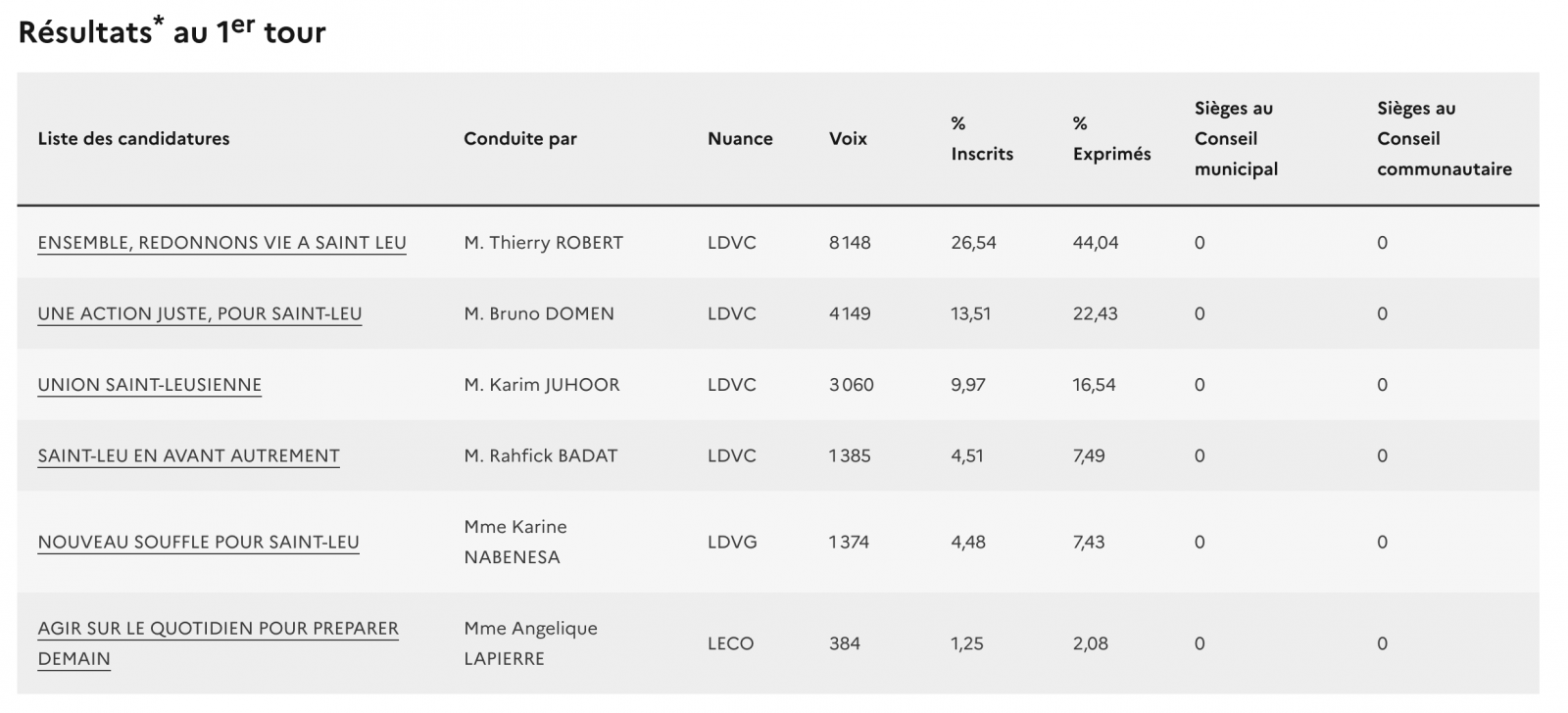 Dans la commune de Saint-Leu, avec 44,04% des suffrages exprimés, Thierry Robert arrive en tête du premier tour.