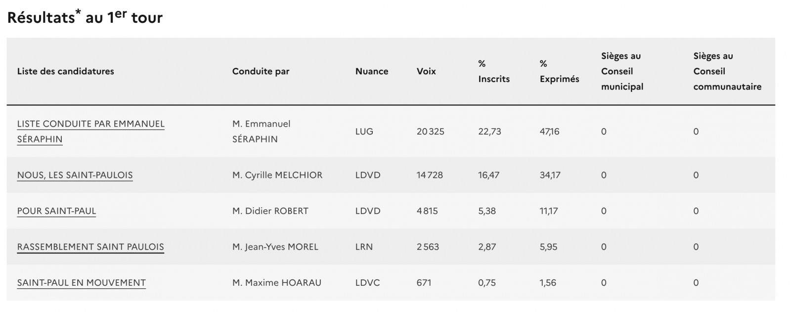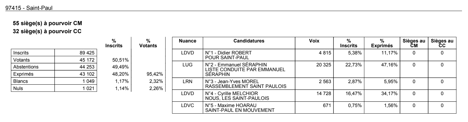 Sur la commune de Saint-Paul, c'est une triangulaire qui se jouera au second tour des élections municipales. En tête lors de ce premier tour, le maire sortant, Emmanuel Séraphin avec 47,16% des suffrages, devant Cyrille Melchior avec 34,17% des votes et Didier Robert avec 11,17%. Les élections municipales ont lieu ce dimanche 15 et ce dimanche 22 mars 2026 (Photo : Stephan Laï-Yu/www.imazpress.com)