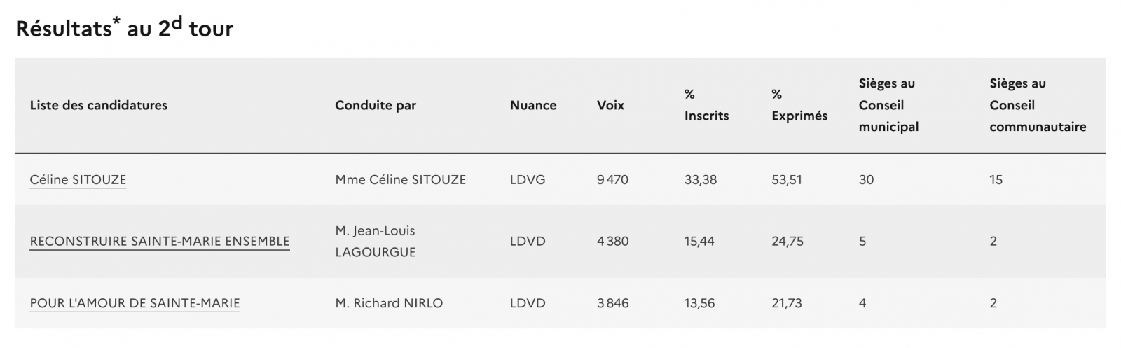 En 2020, Richard Nirlo a remporté les élections à Sainte-Marie avec 57,22 % des votes face à Gérald Maillot.