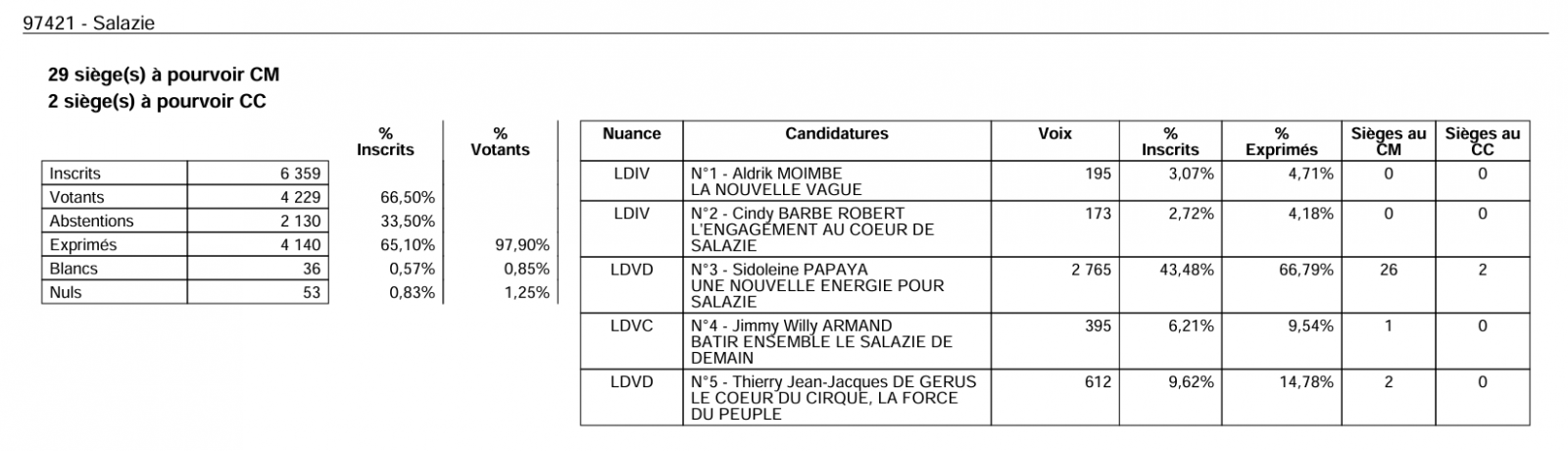 En 2020, Stéphane Fouassin a remporté les élections à Salazie avec 67,98 % des votes face à Eric Emmanuel Eclapier et Giovanni Deletre.