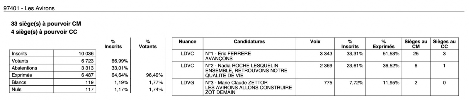 En 2020, Éric Ferrère a remporté les élections aux Avirons avec 58,52 % des votes (3.485 voies) face à Roseline Lucas.