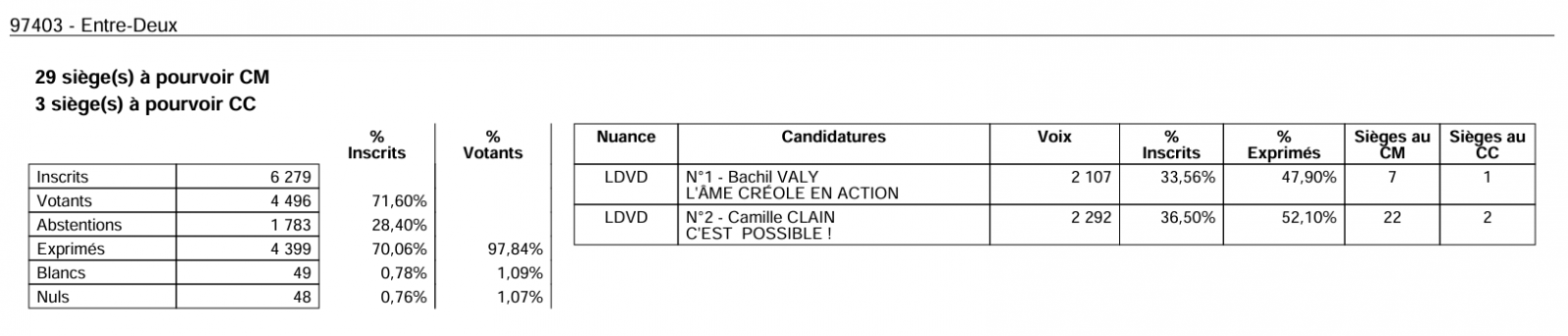 En 2020, Bachil Valy a remporté les élections à l'Entre-Deux au 1er tour avec 56,93 % des votes face à Gilles Payet et Gérard Clain.