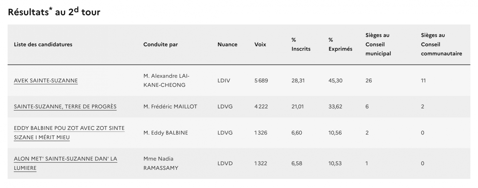 (Actualisé) À Sainte-Suzanne, quatre candidats se sont affrontés pour le second tour. C'est Alexandre Lai-Kane-Cheong qui est élu maire avec 45,30% des voix. Face à lui, la liste fusionnée de Frédéric Maillot (24,77% au premier tour) et Daniel Alamélou (14,36% au premier tour) a récolté 33,62% des suffrages exprimés, Eddy Balbine (15,08% au premier tour) et enfin Nadia Ramassamy (10,43% au premier tour). (Photo : Richard Bouhet/www.imazpress.com)