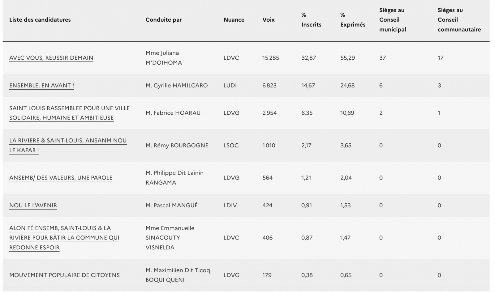 En 2020, Juliana M'Doihoma a remporté les élections à Saint-Louis avec 44,21 % (12.022 des voies) des votes face à Claude-Henri Hoarau et Cyrille Hamilcaro.