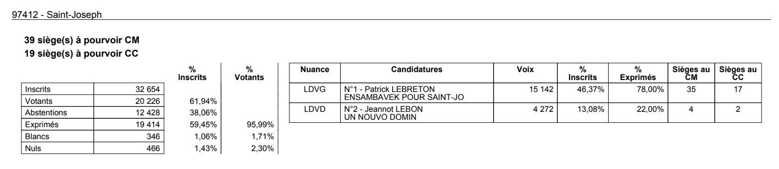 En 2020, Patrick Lebreton a remporté les élections à Saint-Joseph avec 65,77 % des votes face à Louis Jeannot Lebon et Alain Guezello.