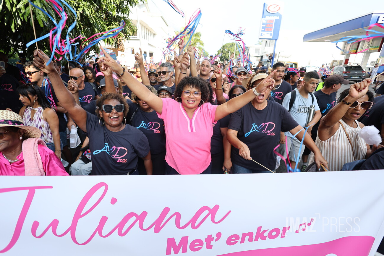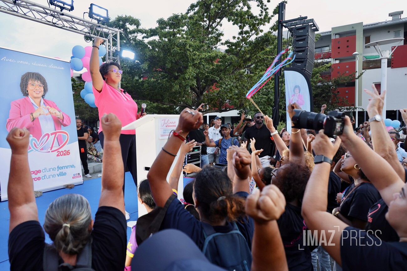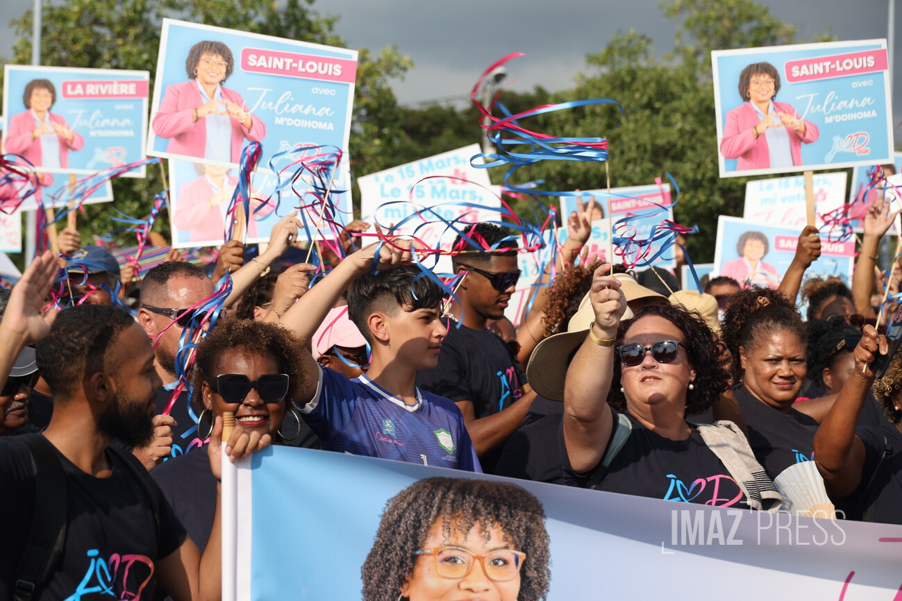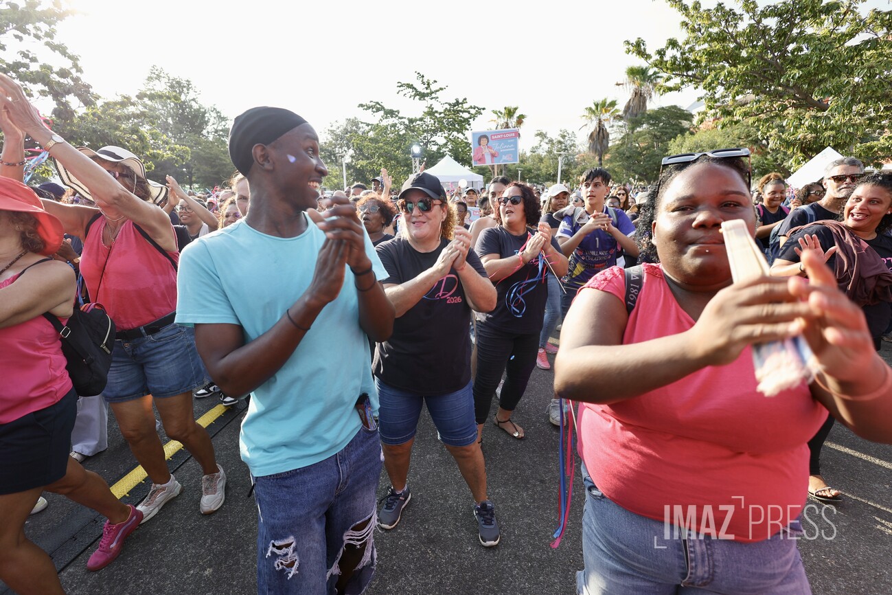 (Actualisé) Ce dimanche 1er mars 2026, la maire de Saint-Louis, candidate à sa réélection, a investi le centre-ville avec ses militants. Julianna M'Doihoma a organisé une déambulation ainsi qu'un flash mob à l'occasion de l'annonce de ses colistiers et colistières (Photo sly/www.imazpress.com)