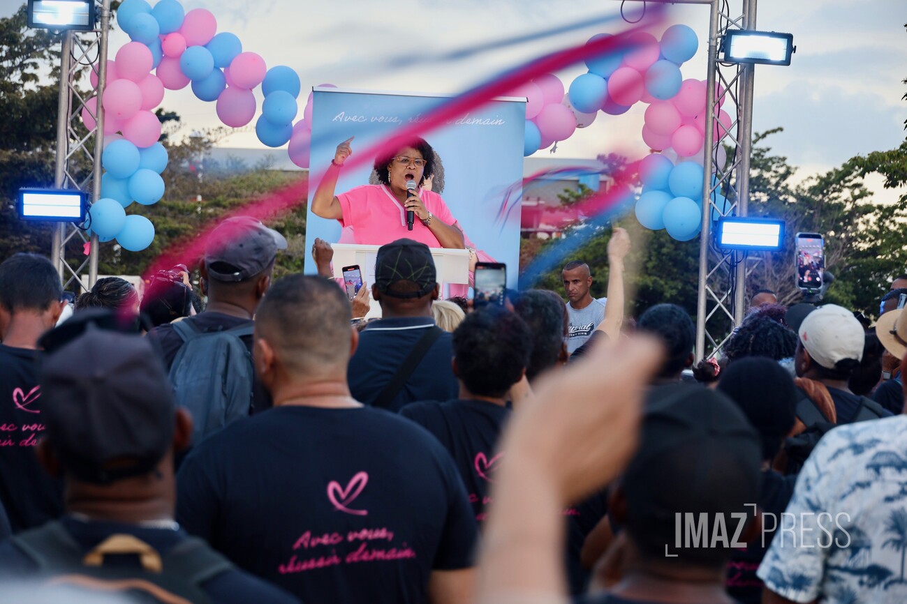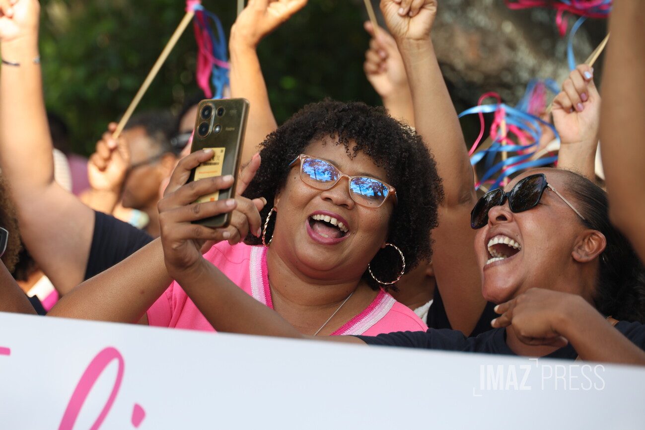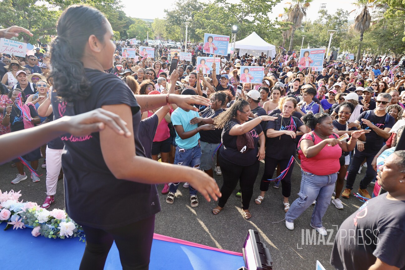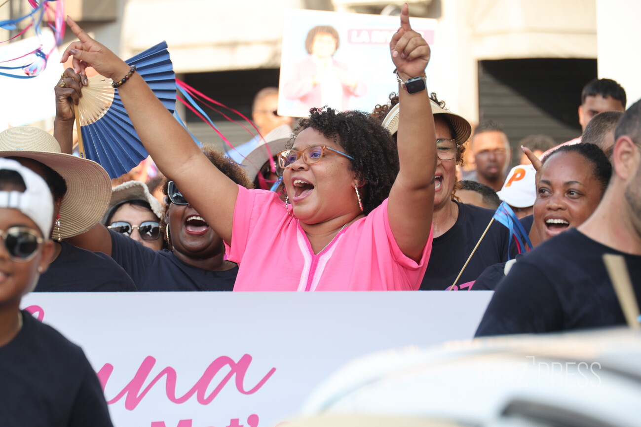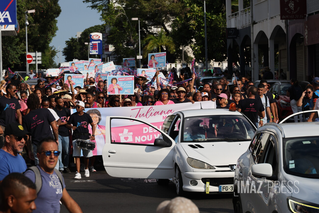 (Actualisé) Ce dimanche 1er mars 2026, la maire de Saint-Louis, candidate à sa réélection, a investi le centre-ville avec ses militants. Julianna M'Doihoma a organisé une déambulation ainsi qu'un flash mob à l'occasion de l'annonce de ses colistiers et colistières (Photo sly/www.imazpress.com)