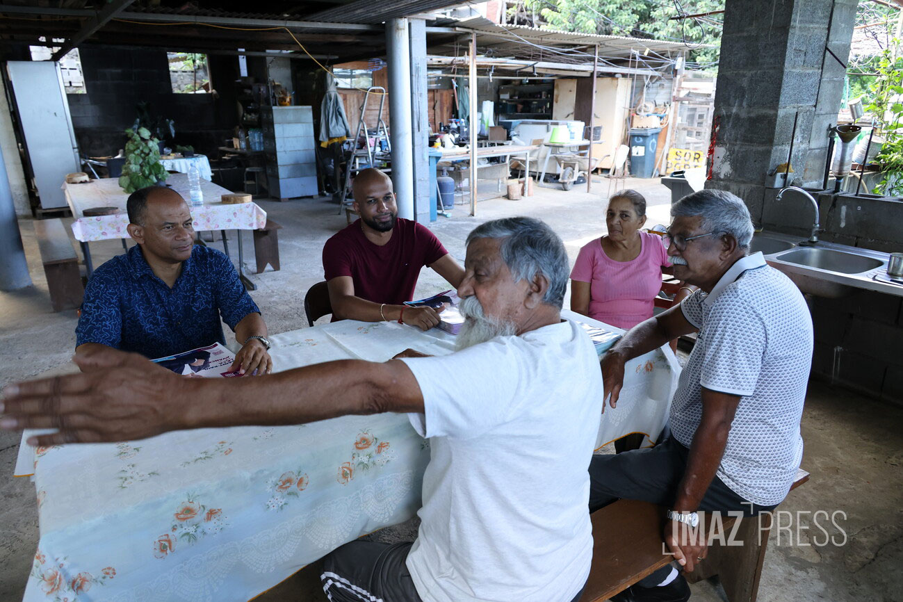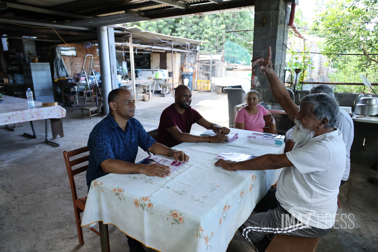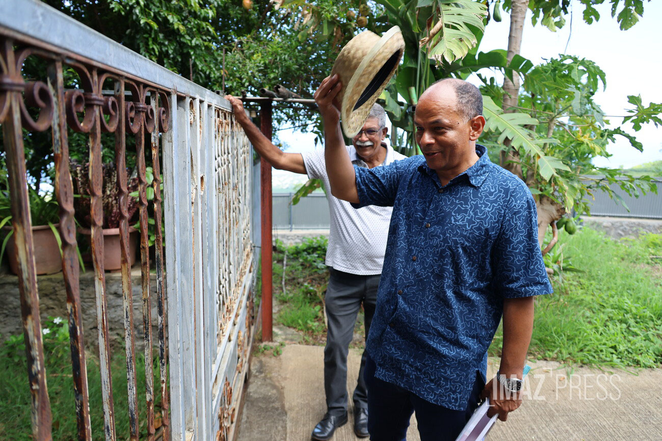 "Oui, oui, na domoun" répond une voix à l'intérieur de la maison. Une dame sort de la kaz à pas vifs. "Bonzour Mésyé lo mèr, zot lé byen" demande-t-elle au candidat qui est accompagné de Seeven Rangamapetchy, président du conseil des habitants du bassin de vie de la Saline, et de Guy Catounia, un habitant du quartier.