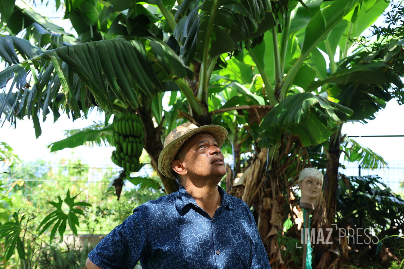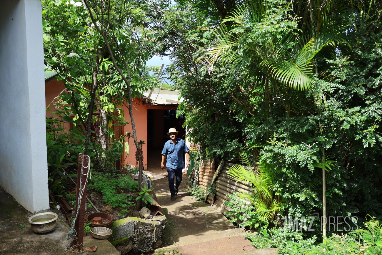 Il est devant le portail d'une kaz a tèr qui longe les deux côtés de la rue. Chapeau de paille vissé sur la tête pour se protéger des rayons d'un soleil brûlant, il est venu à la rencontre des habitants de ce quartier des hauts de la commune.