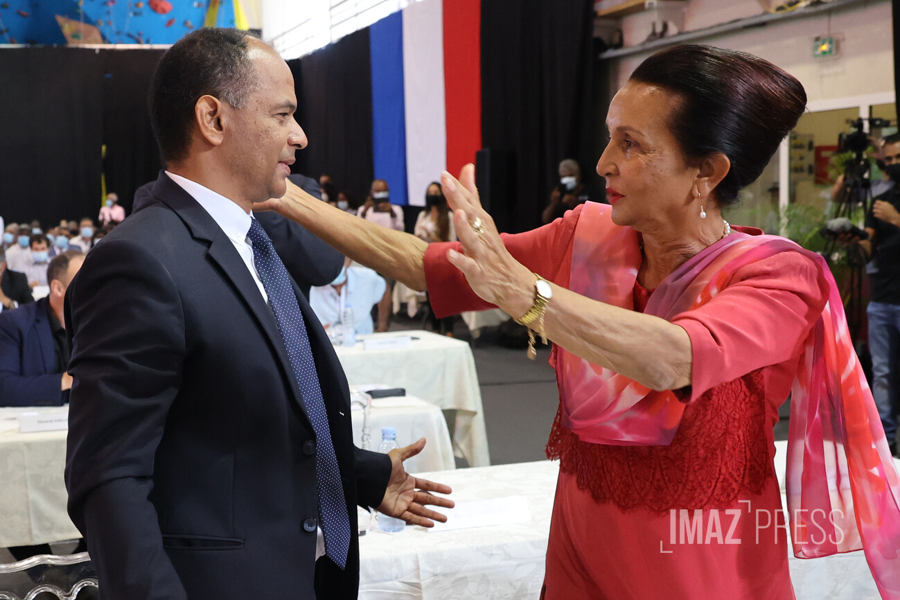 C'est au gymnase du centre-ville de Saint-Paul, qu'Emmanuel Séraphin a retrouvé son écharpe de maire, remise symboliquement des mains de la présidente de Région, Huguette Bello. Lors du second tour des élections municipales, Emmanuel Séraphin a remporté 55,74% des suffrages exprimés, devant Cyrille Melchior (Photo d'illustration : Richard Bouhet/www.imazpress.com)
